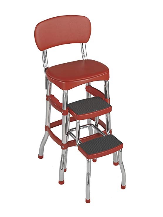Perfecta en la despensa o en la cocina, este elegante funciones del sillón rojo como una percha cómodo o sobre el terreno escalera de mano. Segura y fácil de usar, el buen paso de heces de seguimiento saca de debajo del asiento para la escalada o un reposapiés. Las características del, contador de altura diseño retro fresco silla de un acabado cromado y el asiento de vinilo rojo y respaldo acolchado. Estable con robusto tubo de pierna y seguro con bandas de rodadura de paso sobre-moldeadas. 34Hx15Wx21D”.