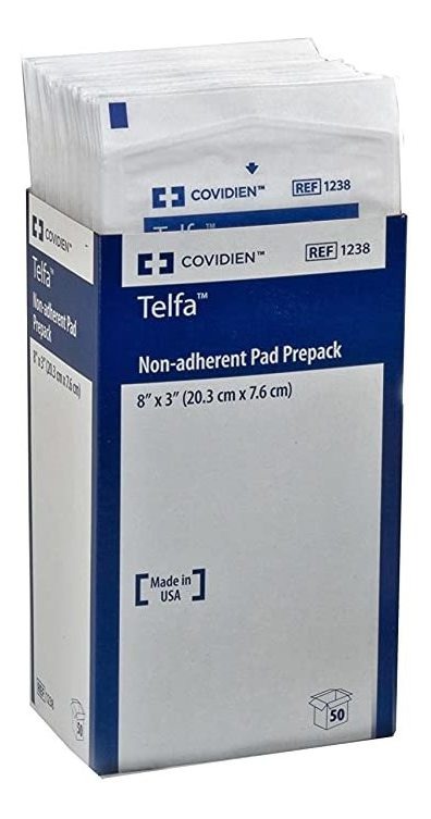 Absorbente algodón pad; Superior telfa no perturbar curación pañuelos por se pegue a la herida; Cada estéril apósito está envuelto individualmente en un sobre peel-open; Ideal como un primaria vendaje para desage ligeramente heridas; En ambos lados con non-adherent perforado Película, y se puede cortar para adaptarse a cualquier forma sin separar Telfa Non-Adherent Pads are a superior dressing that wont disrupt healing tissue by sticking to a wound. They are ideal as a primary dressing for lightly draining wounds, and well-suited as a take-home dressing. Todos nuestros productos estan en inglés SKU 4022240093