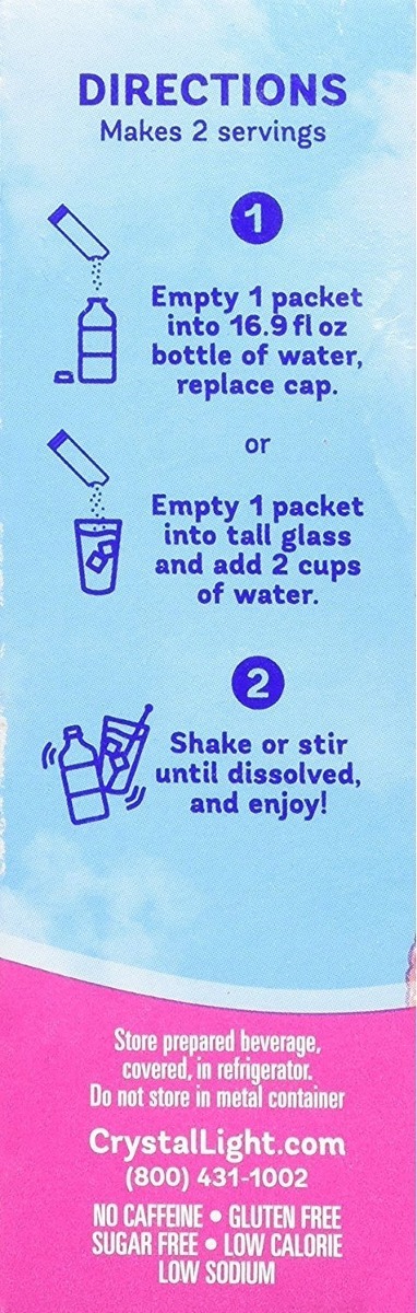 Cada caja contiene 10 paquetes individuales que se mezcla con hasta 16,9 onzas líquidas (500 ml) de agua; Cada 8 onzas (237 ml) que sirve Contiene 5 calorías; Sin Azúcar, baja en sodio y libre de cafeína; Producto Kosher y sin gluten; Crystal Light On The Go tiene Calorías 90% menos que las principales bebidas Crystal Light mezcla de la bebida de agregar sabor a su vida con sólo 5 calorías por porción let. Convierte el agua que necesita en el agua que les encantará. Se transforma el agua ordinaria con sabores de frutas y tés fabulosas tentadoras. Cada sorbo es la manera perfecta para refrescar, renovar y satisfacer su sed de algo diferente. Adicional Filtrado Todos nuestros productos estan en inglés SKU 3011809716