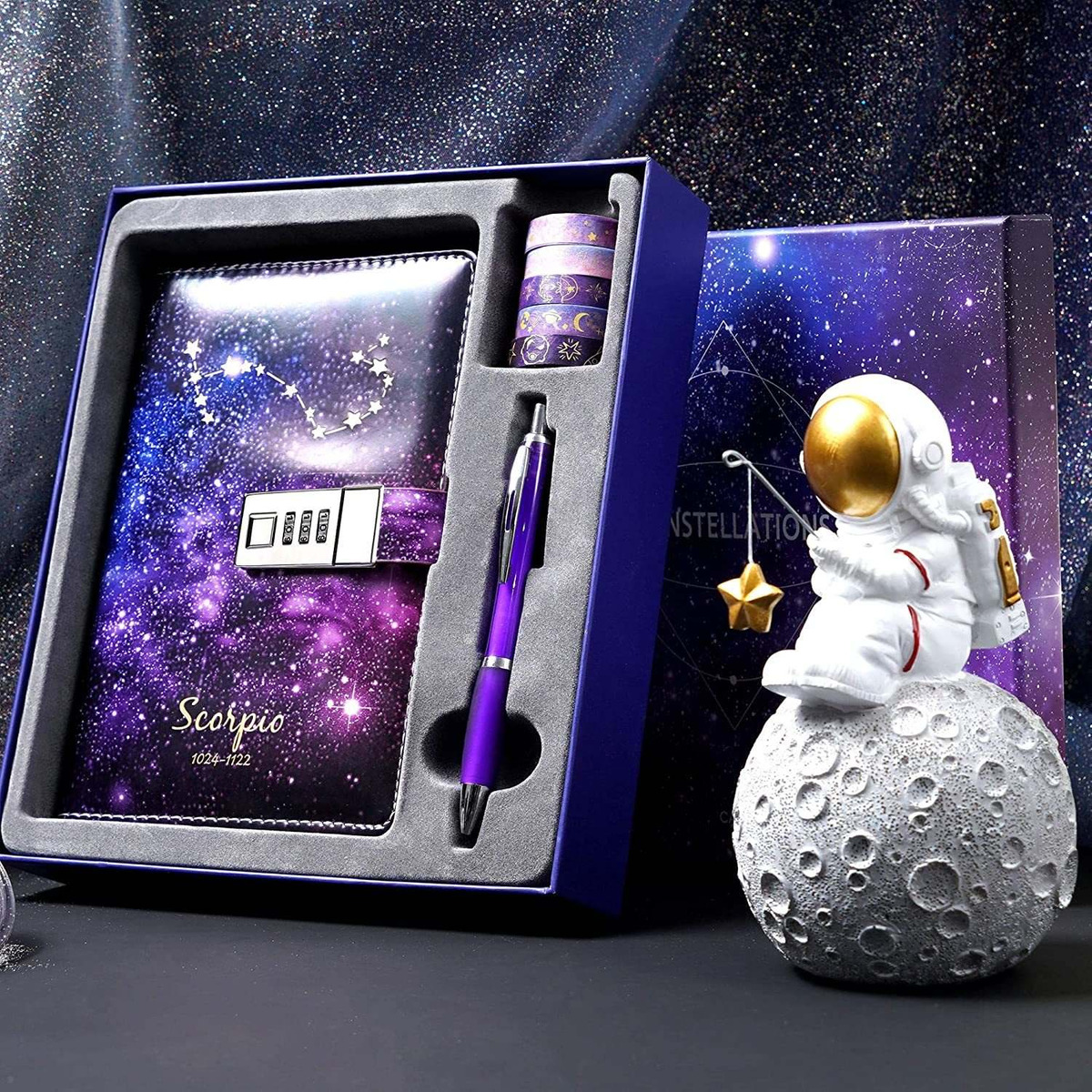 La mejor caja de regalo de lujo Viene con 5 cintas y 1 bolígrafo, empaquetado en una hermosa caja de regalo, este cuaderno de cuero con bloqueo de constelación estrellada es perfecto para todas las personas como un maravilloso regalo de cumpleaños, aniversario, boda, como amigos, familias, amantes y niños, etc.; Características: el tamaño del papel es de 7.5 x 5.1 in, el tamaño de la cubierta es de 7.8 x 5.4 in, hecho de piel respetuosa con los animales. Este diario de tapa dura tiene 118 hojas de papel forrado y papeles lisos, dos marcadores de cinta de diferentes colores, un bonito bolsillo interior en forma de melocotón, un cierre de correa elástica y un cierre de contraseña resistente. Sabemos lo mucho que aprecias la calidad y por eso elegimos papel a prueba de derrames de 3.53 oz/m más grueso para garantizar una experiencia de calidad.; Diseño único: tenemos 12 diarios de constelación estrellada para elegir. La funda está decorada con cada patrón de constelación único. La ilustración que el cielo estrellado impreso en él hace que tu diario destaque. Está hecho de morado y blanco que chocan juntos, lo que hace que la cubierta cobre vida. Libro de tapa dura para mayor soporte de escritura y protección duradera.; Mantiene el estilo vintage: el diario de constelación de cielo estrellado puede traerte un buen estado de ánimo y hacer feliz cada día de tu vida. Y es una gran manera de fomentar la escritura creativa y horas de diversión, un lugar perfecto para grabar recuerdos que pueden durar toda una vida. Puedes disfrutar de bricolaje, escribir tus notas, grabar tu estado de ánimo o ser un buen regalo.; 100% servicio de venta: cada cuaderno de constelación viene con una instrucción. Si no abres o olvidas el código de contraseña, ponte en contacto con nosotros, podemos ayudarte a resolverlo. Si este diario de bloqueo tiene alguna pregunta, le daremos una respuesta satisfactoria. Puede devolverlo y recibir uno nuevo o un reembolso completo. Todos nuestros productos estan en inglés SKU 91221062987