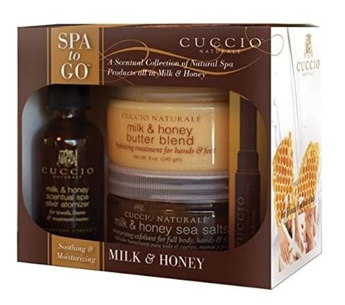 Perfecto en el tratamiento de spa en casa; rica leche y aroma de miel; Anti envejecimiento y la revitalización; País de origen es Estados Unidos Cuccio de 4 piezas de Spa para ir Kit, Leche y Miel Todos nuestros productos estan en inglés SKU 4032111581