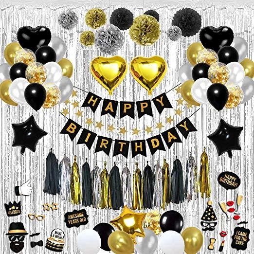 Cumpleaños Decoración Party Kit – Más de 100 piezas del partido del oro Negro y Decoración Set – Incluye muro cortina, globos, papel de aluminio borlas, accesorios de fotos Conjunto, pompones, Bandera del feliz cumpleaños – Durable Guardar su dinero y tiempo: tratar de organizar una fiesta de cumpleaños especial para un ser querido? ¿Le gustaría evitar la molestia de comprar de forma individual decoraciones costosas y que requieren mucho tiempo del partido? Este kit completo fiesta de cumpleaños es la solución perfecta !; SET COMPLETO: Pide este increíble juego de decoración y recibirá todo lo necesario para la completa experiencia de cumpleaños, más de 90 piezas que incluyen látex, papel de aluminio y globos confeti, una bandera del cumpleaños feliz, Foto de muro cortina, pompones, borlas papel decorativo de la pared y apoyos de la foto !; SEGURIDAD ES PRIMERO: Este conjunto de la decoración del partido de los hombres y de las mujeres no sólo es fácil de usar, pero se hace todo materiales seguros, papel de aluminio, papel y látex. Con el fin de evitar que se pegue globos juntos, el paquete también incluye polvo de talco inofensiva .; MAGNÍFICO DISEÑO Y COLORES: Este juego de partido del globo es fácil de mezclar y combinar con todo tipo de decoraciones, desde ultra-elegante a minimalista y moderno, añadiendo un toque de color a cualquier evento! El diseño negro y oro precioso sin duda impresionar a sus invitados !; Crear recuerdos duraderos: A diferencia de productos similares en el mercado, estas decoraciones del partido negro y oro para el cumpleaños vienen con un conjunto de apoyo de la foto incluida y papel de borlas y de cortina, por increíbles fotos y videos de sus invitados! Todos nuestros productos estan en inglés SKU 8111905915