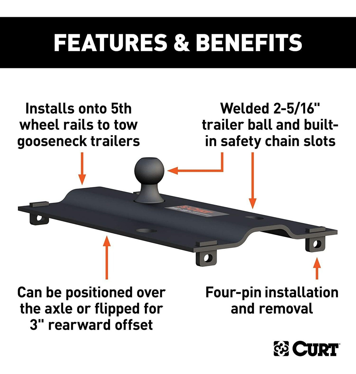 La máxima funcionalidad. Este enganche cuello de cisne único es una quinta rueda al cuello de cisne adaptador. Está diseñado para caer en los carriles quinto distancia entre ejes existentes en su caja de la camioneta y permitir cuello de cisne de remolque. Se le permite maximizar la funcionalidad de su camión para; 5 DE RUEDA DE AJUSTE. Para versátil aplicación, este cuello de cisne quinta rueda de enganche Se adapta a cualquier carriles de ruedas 5th estándar de la industria. Proporciona un balón de cuello de cisne 2-5 / 16 pulgadas estándar para el acoplamiento de un remolque listo cuello de cisne .; REMOLQUE confiable. Esta quinta rueda de enganche cuello de cisne se prueba y calificada para remolcar 25.000 lbs. peso bruto del remolque y 6.250 lbs. carga vertical (limitado a menor puntuación-componente de remolque) .; RESISTENTE A LA CORROSIÓN. Por resistencia a la intemperie fiable, este adaptador de enganche cuello de cisne está blindado en un acabado de pintura en polvo de carburo de alta duración. Este acabado resistente dura más fácilmente la exposición a la lluvia, nieve, suciedad y otros elementos corrosivos .; FÁCIL DE INSTALAR. Esta quinta rueda para adaptador de enganche cuello de cisne cae fácilmente en los carriles de 5º rueda de enganche y se asegura con 4 pasadores de enganche incluidos. Puede ser colocado sobre el eje del camión o volteado y ajustado por 3 pulgadas de desplazamiento hacia atrás para c añadido El hecho de instalar los soportes de las ruedas 5 y rieles en su caja de la camioneta no significa que su camión se limita a un tipo de remolque. Para darle a su camión de las herramientas que necesita para ser la última máquina de remolque, ofertas CURT un adaptador de cuello de cisne para una configuración de rueda quinta. Una placa de quinta rueda Todos nuestros productos estan en inglés SKU 70720016044.8