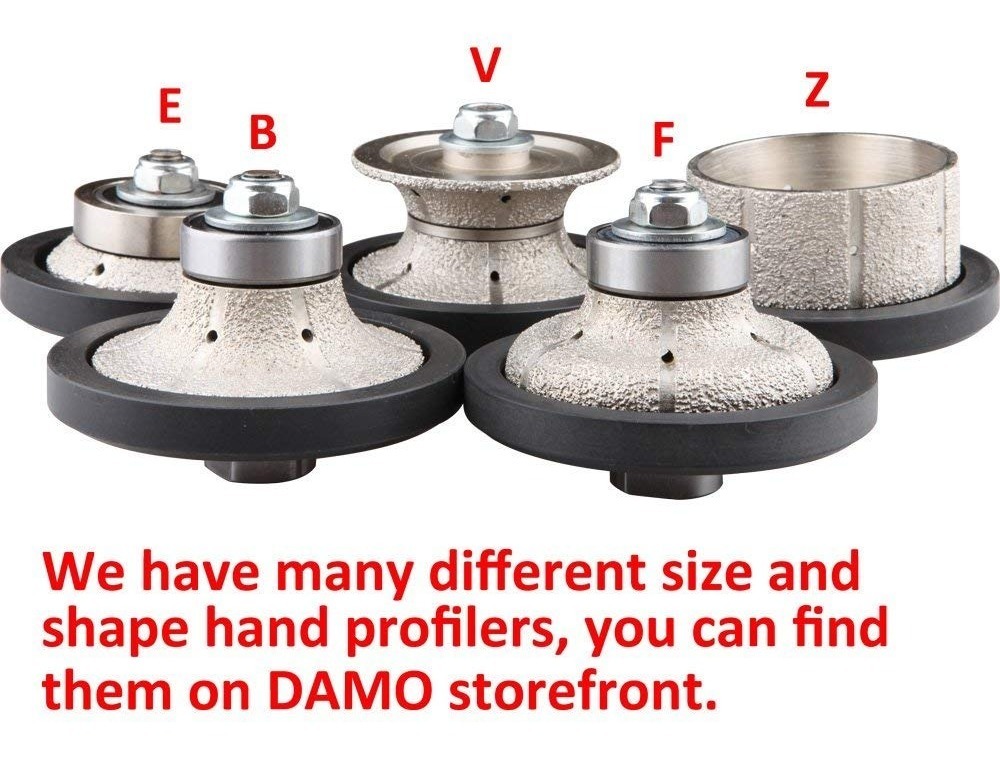 Nos Herramientas de diamante DAMO, LLC sostiene la distribución exclusiva de productos de marcas DAMO como se puede ver claramente marcado de la imagen en la lista de productos. Para 1-1 / 4″ de espesor (granito) y por debajo ;; eliminar rápidamente de valores y suavizar los bordes ásperos de agujero del fregadero recortes ;; adapta en pulidores / amoladoras con 5/8″ -11 husillo hilo ;; La guía de nylon asegurar el borde perfilado permanece recta ;; aplicación en húmedo o en seco, velocidad óptima 3,500 4,000 RPM. Todos nuestros productos son de Estados Unidos SKU 31071850500