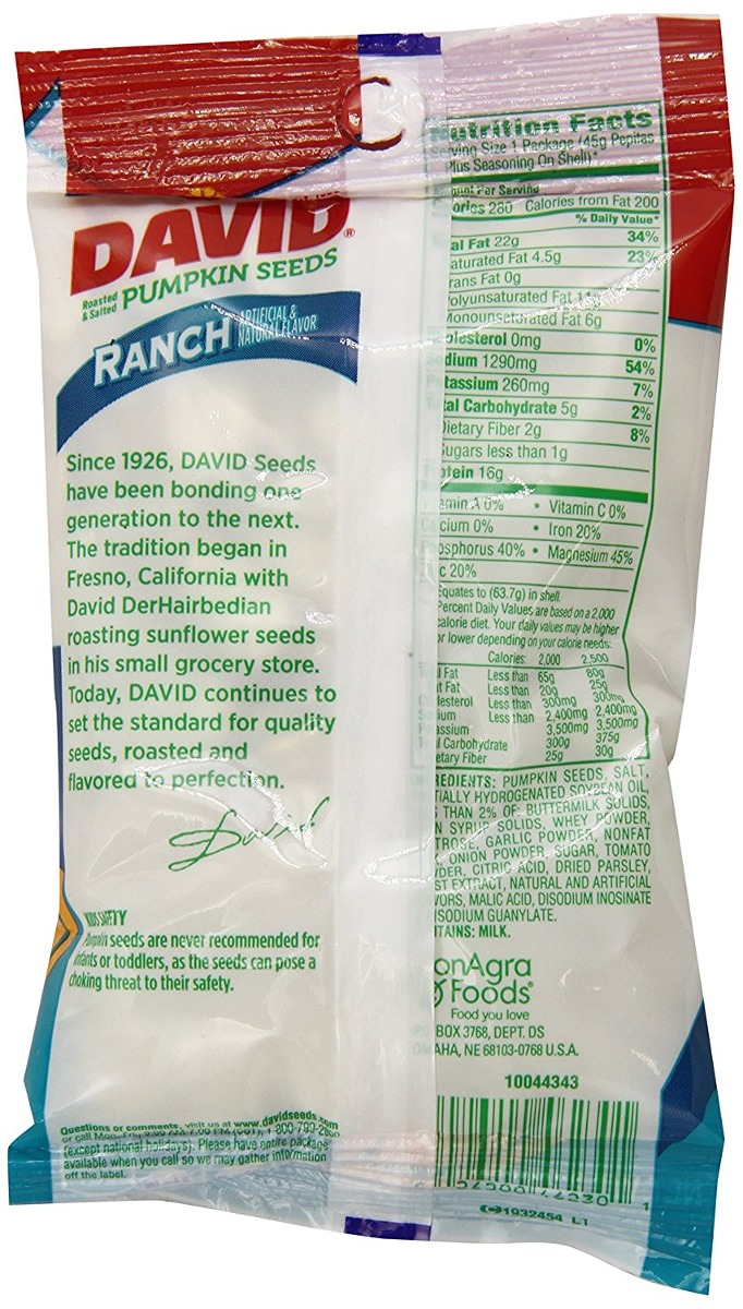 semillas de calabaza David; sabor Rancho; Un delicioso aperitivo que es divertido para comer; Disfrutar en cualquier momento con amigos y familiares; Llevar al juego de pelota, el paquete en la caja de almuerzo, y más Vamos a brillar una nueva luz sobre la semilla de girasol. Todas las semillas-estadounidense David son naturalmente libres de colesterol, y son una buena fuente de vitamina E y una excelente fuente de fósforo y magnesio. Además, las semillas de girasol paquete de hasta seis gramos de proteína por onza. Lo mejor de todo, David semillas son divertido para comer porque son un aperitivo y la actividad en uno. Experiencia snacktivity. Prueba una de nuestras muchas variedades de hoy, incluyendo las semillas de girasol y de calabaza, mezcla de frutos secos y almendras. Acerca de alimentos ConAgra: David es un miembro de la familia de alimentos ConAgra, uno de los mayores fabricantes de alimentos del norte de Estados Unidos con alimentos de marca de marca y privado que se encuentra en el 99 por ciento de los hogares de los Estados Unidos, así como un fuerte negocio de alimentación comerciales sirviendo restaurantes y operaciones de servicio de alimentos a nivel mundial. Nuestros más de 70 marcas incluyen favoritos como pam, la caza de, opción saludable, Wesson, rotel, Peter Pan, Marie Callender, hebreo nacional, chile marca lobo, Rosaria, batidores de huevos,, Swiss Miss Orville Redenbacher, y mucho más. Adicional Filtrado Todos nuestros productos son de Estados Unidos SKU 3011816868