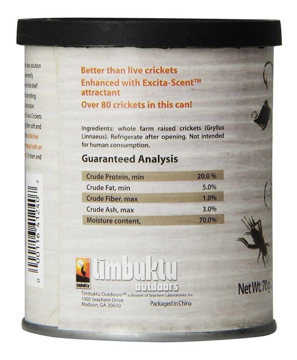 grillos de cebo en conserva; Todo vapor cebo en lata naturales esterilizado que las cerraduras en la humedad y olores natural y una mayor durabilidad, lo que significa más moldes; Mejorado con ExcitaScent, que es un potente atrayente aroma; Cada vez es más ampliamente conocido que los peces son en gran medida impulsado olor criaturas; Bueno para todos los tipos de pesca cebos Choice enlatados de Fisher pasan por un tratamiento en retorta, o proceso de esterilización que, técnicamente ‘cocineros’ el cebo sin cocinar; esto da lugar a una textura que se mantiene suave pero ligeramente más firme que el cebo vivo. Esto permite una mayor durabilidad en la pesca, más moldes, y, en el caso de los grillos, grillos más integrales y menos rompieron las piernas de cricket. El proceso de envasado única de Elección de Fisher encaje en jugos naturales, manteniendo los cebos suave y húmeda, al igual que el cebo vivo. Sin embargo, a diferencia de cebo vivo, que han sido también mejorados con un atrayente aroma natural. SKU 8031818504