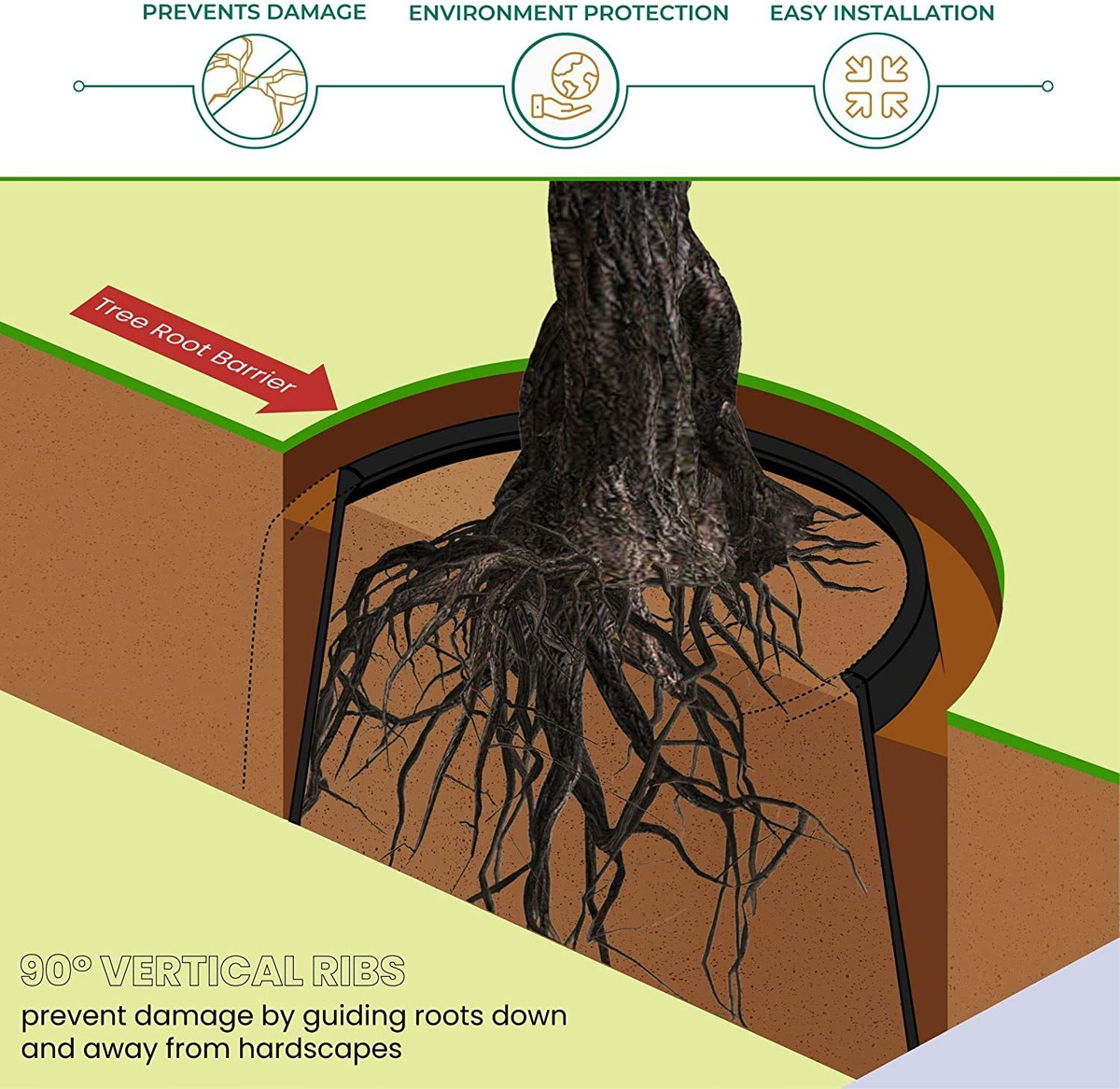 Cinco (5) – 18 de profundidad x 24 de ancho paneles por paquete, lo suficiente para un árbol de 5-15 galones; 90 nervios verticales Grado evitar daños por las raíces hacia abajo y lejos de hardscapes guía; Cremallera sistema para una rápida y fácil disposición de unión; Moldeado por inyección 75% re-procesado de polipropileno; Hecho en los EE.UU. Tamaño: 18 pulgadas Profundidad – Paquete de 5 Retail Kit | De color negro