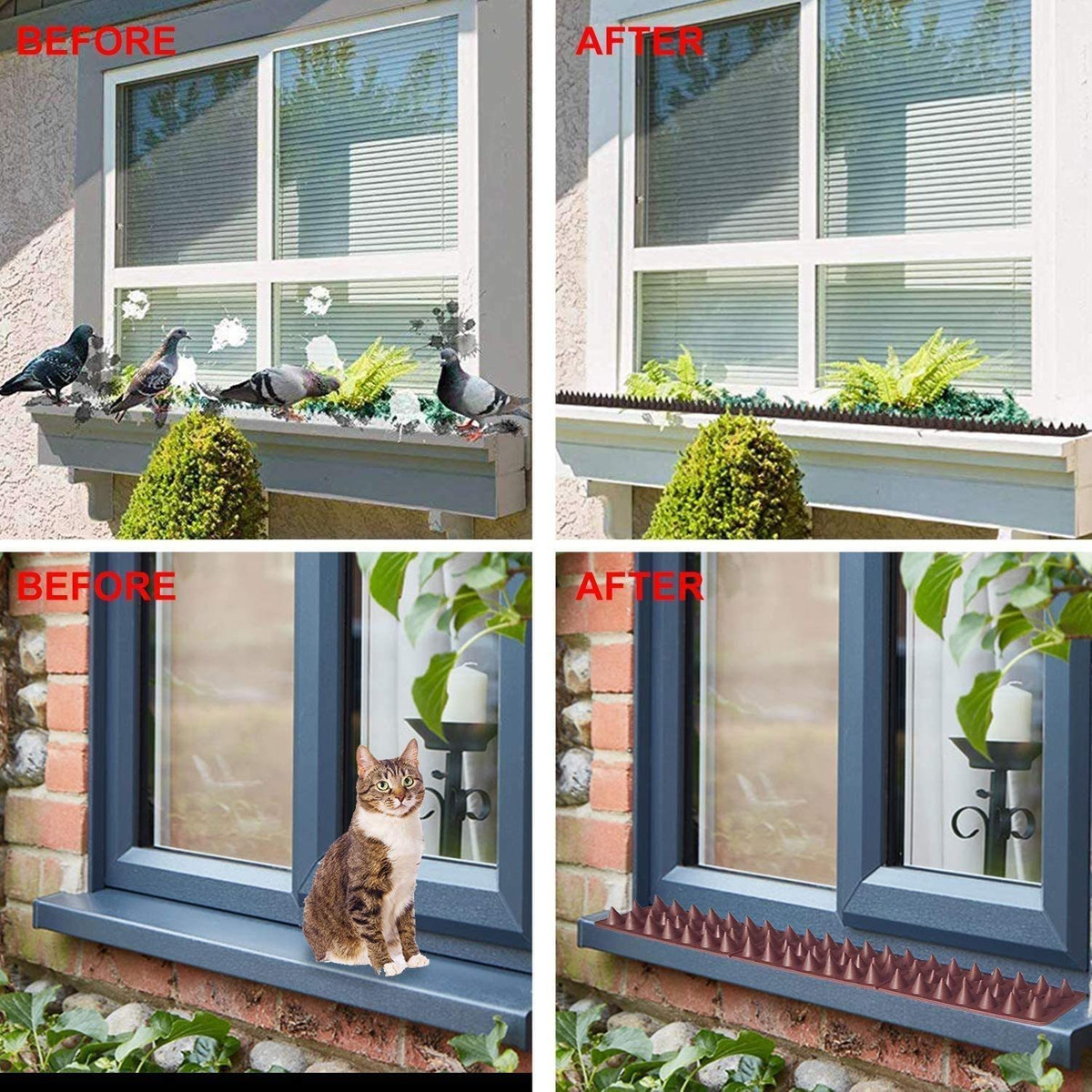Formas innovadoras de conducir gatos y pájaros: Los muebles recientemente comprados y las plantas en maceta son destruidas por gatos Los pájaros vivos siempre tiran Molesto Por qué no probar nuestros picos para pájaros Un enfoque innovador para proteger tu propiedad de intrusos.; Actualizable y duradero: Hecho de material importado de alta calidad, completamente diferente de los plásticos generalmente reciclados, los pinchos disuasorios de pájaros en U son más resistentes y duraderos. Muchas pruebas demuestran que no se deformará bajo un fuerte sol.; Protege tu propiedad de la pérdida: con diferencia de altura y espina cónica elevada, los pinchos de prevención de nido de pájaros en forma de U harán que los animales pequeños se sientan incómodos y huyan. Puede prevenir eficazmente pájaros, gatos, perros, animales pequeños e incluso intrusos humanos contra intrusos que entren en paredes, patios, ventanas, pero no les daña, lo que puede proteger tu propiedad de la pérdida.; Fácil de instalar y amplia gama de aplicaciones: el tamaño de cada uno es de 1.7 x 11.8 in, puedes unir libremente la longitud y el ancho que desees. Simplemente instalar con tornillos o tiras de plástico en cualquier superficie plana, como paredes de límites, vallas, cobertizos, puertas, etc.; No más molestias: con los pinchos U-Pick Defender, no tendrás que preocuparte de que el gato corra a tu dormitorio o devaste tu sofá, muerda el alambre o destruya tus plantas. No te molestará con la basura y el ruido de los pájaros en tu techo y valla, incluso puedes evitar el acoso de animales pequeños perdidos. Nota: No es adecuado para disuadir a ardillas y perros grandes. Defensor Spikes será el buen ayudante del patio contra aves de plagas, gatos callejeros, bichos y ladrones.