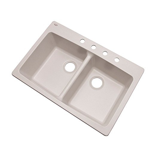 Sink mide 33 pulgadas x 22 pulgadas x 8,5 pulgadas de profundidad; cuatro agujeros del grifo pretaladrados; La instalación en una doble; pueden ser drop-in o bajo montado; fácil drop-in de instalación; no hay clips requeridos; duradero, la superficie dura, no porosa es el calor, al rayado y resistente al desconchado; respaldo de fibra de vidrio proporciona resistencia y estabilidad adicional, ayuda a mantener la temperatura del agua, y actúa como una barrera de sonido para trituradores de alimentos; lavabos de granito compuesto tienen manchas y acabado resistente a la corrosión y son fáciles de limpiar con productos de limpieza no abrasivos Color: blanco suave | Estilo: Cuatro orificios