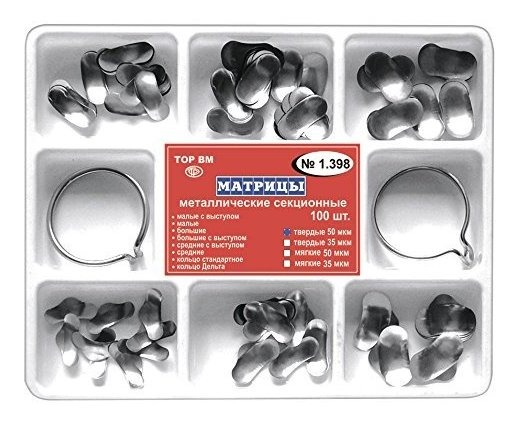 METAL PARTS MATRIX: Matrices sección de metal destinado a separar las superficies aproximadas de los dientes vecinos durante la restauración de tipo II. Todas las matrices son volumétrica, cóncava, formada a partir de un acero especial resistente a la corrosión. Están hechas de acero especial resistente a la corrosión con el espesor de 35 o 50 micras. Hay 4 tipos: 50 m sólidos, 35 m sólidos, 50 m suave y 35 suave m. matrices finas son conveniente utilizar para la restauración de defectos pequeños, las gruesas – para la restauración de grandes cavidades cariosas con la destrucción en la región subgingival. matrices gruesas mantener la forma, así, que en algunos casos no permite el uso de cuñas cuando se restaura el margen gingival o de la pared Arbor. matrices duros son más fáciles de introducir, sin embargo, su adaptación a la formación de un punto de contacto es difícil. Todos nuestros productos estan en inglés SKU 6042007280