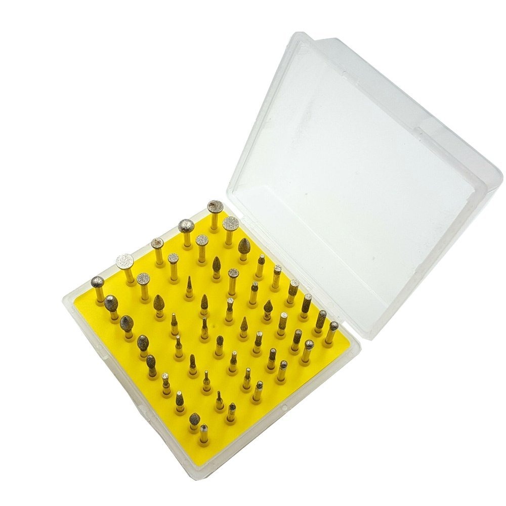50 surtidos Jefes, Estilo de cabeza Pequeña, revestidas de diamante rebabas rotatorias; Tamaño vástago: 1/8 Pulgadas, Grit: 120; Varias Formas incluídas, cuentos Esferas Como, cilindros, balas, Agujas, etc.; Diseñado Herramientas Para rotativas, Envases caja de plástico, Fácil de Almacenar y Transportar; Ideal para Trabajar con cerámica, azulejos, baldosas, piedra, vidrio, metal y Más Color: Estilo Head Pequeño