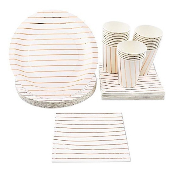 SIRVE 24: Incluye suficiente vajilla para 24 personas; contiene 24 de cada uno de los siguientes: platos de papel, servilletas y vasos metálico con rosa patrón de impresión rayas hoja de oro .; Alta calidad: Las placas son gruesas y rígidas y no se doblará mientras lleva los alimentos. Servilletas son de 3 capas, suave y absorbente – un placer de usar .; Segura y ambientalmente amigable: platos, vasos y servilletas son de papel biodegradable medio ambiente .; GRANDE PARA LOS PARTIDOS: Adecuado para niños o adultos partes de cumpleaños, bodas, baby showers, despedidas de soltera, fiestas temáticas, y reuniones familiares. Servir la cena a los huéspedes en catering, buffet, potluck, eventos o comidas diarias .; DIMENSIONES: Vasos de papel tienen aproximadamente el 9 onzas de líquido. Servilletas son de 3 capas y miden 6,5 x 6,5 pulgadas cuando está plegada. Las placas son de 9 pulgadas de diámetro. Este paquete desechable Partido vajilla tiene toda la vajilla de papel que necesita para 24 huéspedes. Incluye 24 de cada uno de los siguientes elementos: platos de papel, servilletas, vasos. Las placas son gruesas y rígidas y no se doblará mientras lleva los alimentos. Servilletas son suaves y absorbentes – un placer de usar. Platos, vasos y servilletas son de papel biodegradable con el medio ambiente. Conveniente para los partidos niños o adultos cumpleaños, baby showers, despedidas de soltera, fiestas temáticas, y reuniones familiares. vasos de papel poseen aproximadamente el 9 oz de líquido. Servilletas son de 3 capas y miden 6,5 x 6,5 pulgadas. Las placas son de 9 pulgadas de diámetro. Todos nuestros productos estan en inglés SKU 4061921013