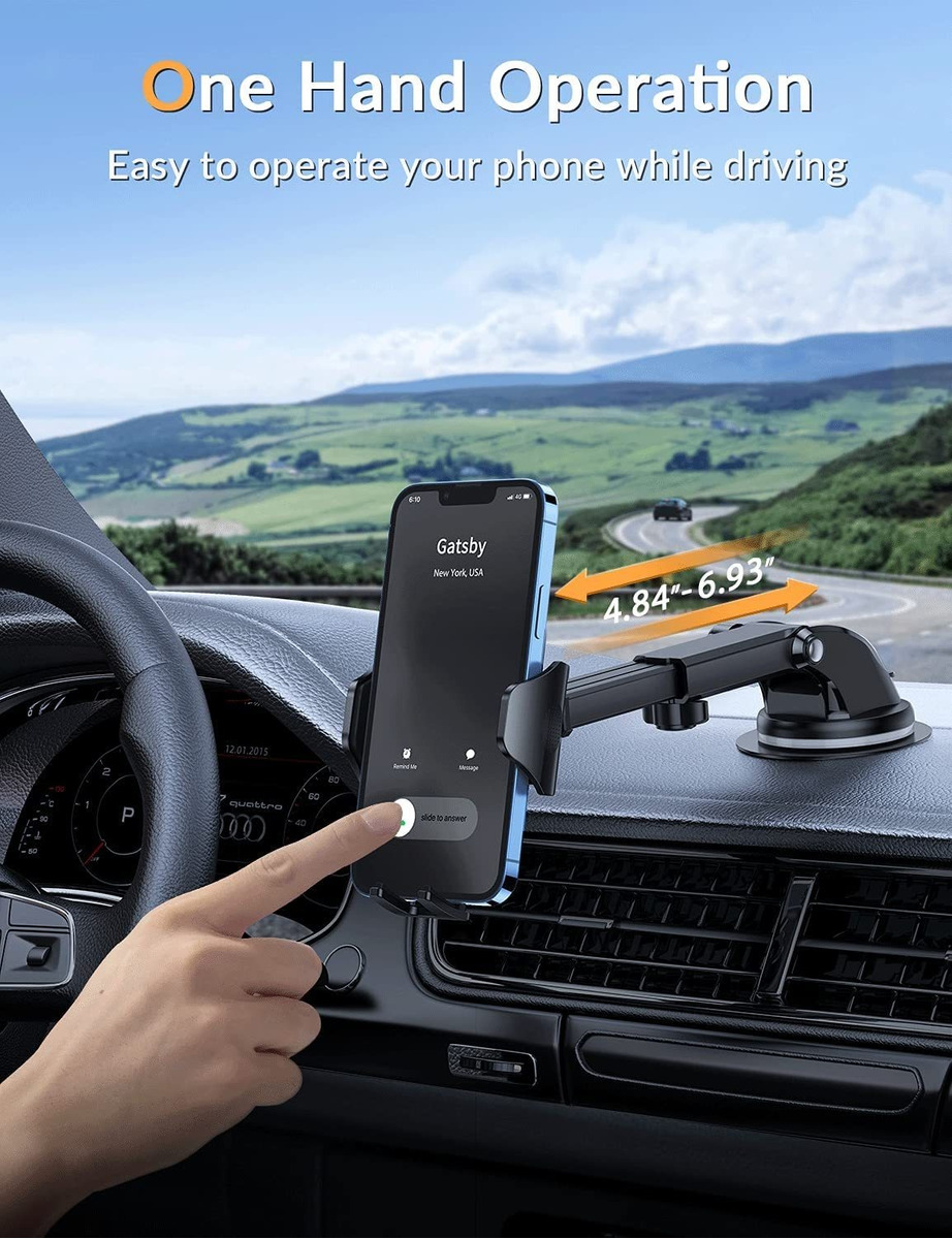 Resistencia de grado militar: hemos mejorado enormemente nuestro soporte de teléfono para coche a la mejor versión que se haya basado en comentarios de más de 8.000.000 clientes. Con la fuerte fuerza de sujeción que es de hasta 52 libras (equivalente a una docena de iPhone 13), es 20 veces más resistente que los normales. Ventosa extra fuerte con almohadilla de gel superadhesiva que se adhiere firmemente a tu salpicadero o a la mayoría de superficies planas.; Soporte de teléfono 3 en 1: este soporte de teléfono para coche se puede montar universalmente en el salpicadero, parabrisas o rejilla de ventilación. También cuenta con un sistema de liberación de un solo botón que te permite bloquear o liberar tu teléfono con una sola mano. El soporte para teléfono se mantendrá estable en el coche, incluso si giras, frenas o conduces en carreteras con baches. Puedes poner el soporte en el coche, camión o SUV, mantendrá el teléfono estable para asegurar una conducción segura.; Compatible con fundas gruesas: el soporte de teléfono para coche es compatible con todos los smartphones y fundas gruesas, como iPhone 13 Pro / iPhone 13 Pro Max / iPhone 13 / iPhone 13 Mini / iPhone 12 Pro Max / iPhone 12 Pro / iPhone 12 / iPhone SE / iPhone 11 Pro Max / iPhone 11 Pro / iPhone 11 / Xs Max / iPhone 1 / Xs XR / X / 8. / 8 Plus / 6 / 6S / 7 / 7 Plus, Samsung Galaxy Note 20 / S20 / 10 / S10 / S10 Plus / S10e / S9 / S9 Plus / S8 / S8 Plus, etc.; Múltiples ángulos de visión: la rótula ajustable permite una rotación de 360 para ángulos de visión óptimos de tu dispositivo. El brazo telescópico ajustable se adapta a la longitud deseada de hasta 9.84 pulgadas (9.8 in), puedes ajustar la distancia como desees. Disfruta de una experiencia de conducción más segura y relajada mientras colocas tu teléfono en el ángulo perfecto.; Manos libres y protección completa: se libera fácilmente con un botón, se sujeta rápidamente con una mano. Adopta fibra de carbono sintética que absorbe los golpes en este soporte para teléfono celular de coche, goma de silicona sólida más ajustada en las abrazaderas laterales y pies de sujeción para evitar eficazmente golpes, arañazos, volar y ruido anormal en tu teléfono celular en todo momento. Tu dispositivo se mantendrá seguro en el soporte del teléfono sin rayar las aspas de ventilación. Todos nuestros productos estan en inglés SKU 91221081526