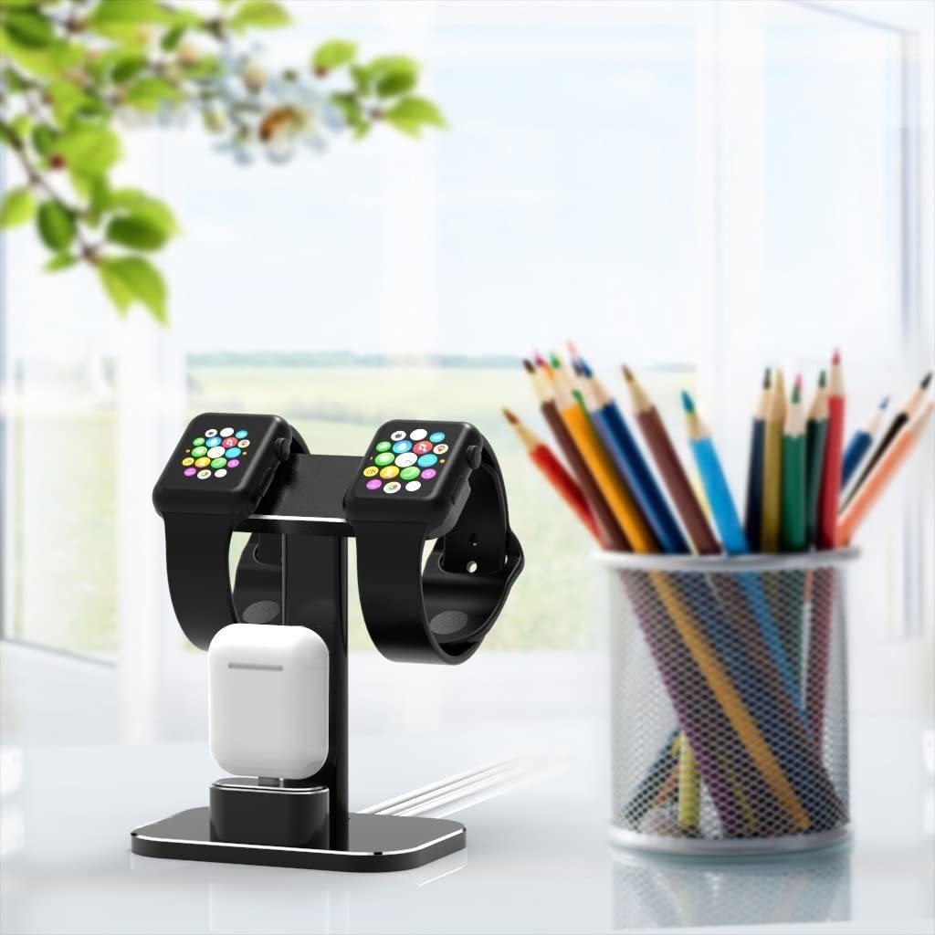 Soporte 2 en 1 para Apple Watch: este exclusivo soporte de dos cabezales para iWatch está especialmente diseñado para cargar dos iWatch y un Airpods al mismo tiempo; perfecto para parejas y hermanos, tiene funcionalidad y belleza; funciona como un soporte para Airpods, tus Airpods nunca se perderán. Nota: todos los cables no están incluidos.; Construcción sólida y excelente mano de obra: hecho de aluminio premium, este resistente soporte de carga para Apple Watch cuenta con una superficie lisa y bordes refinados. Toda la superficie táctil de tu dispositivo o mesa se incrusta con una almohadilla de goma para evitar arañazos. Los canales de alambre están bien ocultos para cables originales de Apple.; Una obra de arte exquisita: las líneas limpias y el diseño moderno de este soporte para iWatch lo convierten en una delicada obra de arte para tu hogar u oficina. Este cargador de doble cabeza para iWatch puede cargar tus productos de Apple de forma rápida y ordenada, liberándote de cables desordenados y mesa desordenada.; Haz tu vida cómoda: no hay necesidad de preocuparse por encontrar cables y enchufes, este soporte de carga para Apple Watch te permite cargar dos Apple Watch y un Airpods en un solo lugar y también al mismo tiempo. Fija tus dispositivos Apple en el soporte cuando se carga, no se caerá de nuestra estación de Apple Watch.; Compatibilidad: este cargador de Apple Watch está diseñado para Apple Watch Series 6/se/5/4/3/2/1/Nike/Sport/Edition (1.496 in/1.654 in); Apple Airpods. Garantía de por vida, por favor póngase en contacto con nosotros con cualquier problema sobre nuestro producto, nuestro equipo de servicio posventa está de pie. Color:Negro