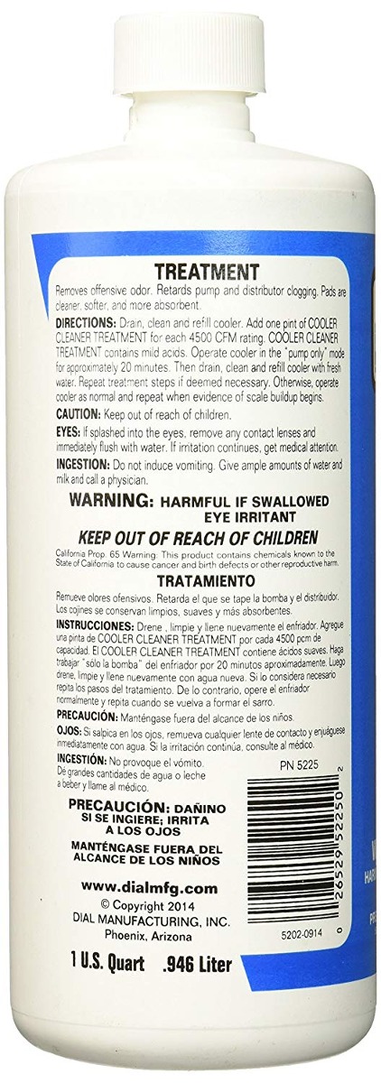 Qt, limpiador 1 paso más fresco, inhibe la acumulación de incrustaciones, óxido y olor ofensivo, almohadillas condiciones más frías para reducir la temperatura del aire, contiene ácidos suaves y agentes humectantes, no para el agua potable. El producto se fabrica en Estados Unidos. De fácil instalación y fácil manejo. El producto se fabrica en los Estados Unidos Todos nuestros productos son de Estados Unidos SKU 31071825224