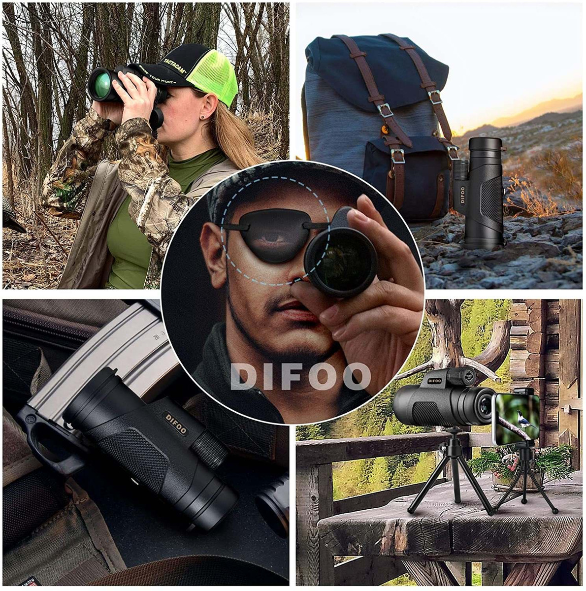 Ventaja D DIFOO El monoscopio this Equipado con Un Solo parche de ojo. Se Lleva Cuando Se Requiere ONU USO Prolongado de Observación y reducir en gran Medida La fatiga visual. fatiga visual .; Diseño de doble Soporte: el telescopio Adopta un diseño de doble Soporte, Que Mejora en Gran Medida La Estabilidad de la Fotografía del producto y la Grabación de vídeo. Todos con compatibles Los Otros teléfonos inteligentes del Mercado. Fácil de Instalar. : Además, también Tiene Un diseño Integrado de visión nocturna para ayudarte a ver Las cosas con poca luz (Nota: no Se Puede Como utilizar Completamente oscuro) .; F Lente de Alta Definición BAK 4 y Una Cubierta Totalmente MULTICAPA (FMC), la Capacidad de transmisión de luz es del 99,6%. Estós Parámetros Dan La Oportunidad de Recibir la imagen Más brillante y de Mayor contraste Si Vas A senderismo, caza, escalada de montaña, Observación de aves, fauna y paisaje, campo, Rango de Disparo, Vigilancia, conciertos y Viajes .; O IPX 7 impermeables La estanqueidad absoluta del monocular this Asegurada con la Alta Calidad de los Materiales utilizados para el Montaje. El monocular this 100% protegido de Ser golpeado con La Humedad, El Polvo y la basura. : Además, el monocular ESTA Lleno de Nitrógeno Que Garantiza la Protección Contra el empañamiento de las lentes .; Embalaje y posventa: TENEMOS Una bolsa portátil para exteriores Que PUEDE Almacenar no monoculares en solitario, también Sino todos los accesorios ADICIONALES (adaptadores de teléfono inteligente y trípodes). Se Puede Como utilizar para Viajar o enviarlo a tu familia o amigos Como regalo. Proporcionamos 30 Días de devolución de dinero gratis, 1 año de Apoyo al vendedor y servicio de Correo electrónico Dedicado de por vida para Asegurar su DISFRUTE un largo Plazo. Características del producto: