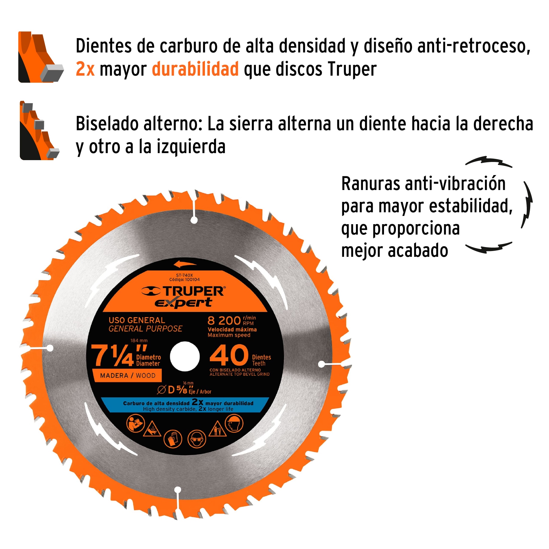 Disco sierra 7-1/4 pulgadas para madera, 40 dientes centro 5/8 pulgadas, Expert