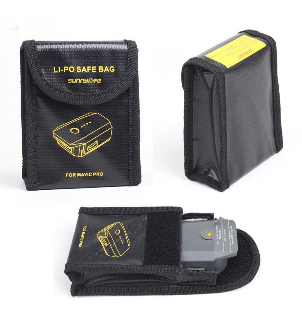 3 x bolsa de seguridad de la batería Resistencia al calor, la protección radiológica, la bolsa de seguridad de la batería Lipo a prueba de explosiones. Una herramienta imprescindible para el caso de carga de seguridad baterías, viajes, transporte o almacenamiento; Hecho de fibra de vidrio retardantes de llama de tela tejida, por lo que ser capaz de soportar altas temperaturas con ganchos y bucles de cinta para cierre seguro y es fácil de abrir y cerrar; Buen material, de alta calidad y duradero. diseño de sellado Velcro, cómodo de usar y carga de la batería .; diseño de tamaño perfecto para la batería DJI Mavic Pro / Platino. Pequeño exquisito, cómodo de llevar, los viajes, el transporte y el almacenamiento .; Tamaño: 11,5 x 9,5 x 4,6 cm / 4,53 x 3,74 x 1,81 pulgadas Todos nuestros productos estan en inglés SKU 10101909796