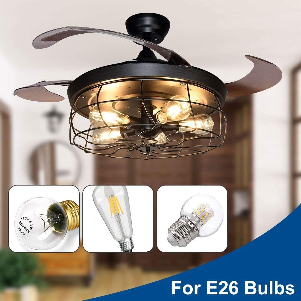 Control remotoEl ventilador de techo de granja con 3 velocidades de ajuste (bajo/medio/alto) y 4 opciones de temporizador del ventilador (1/2/4/8H) apagado de sueño. El ventilador y las luces se pueden controlar por separado.; Cuchillas de ABS retráctiles e invisiblesEste ventilador de techo negro tiene una función retráctil. Cuando el ventilador de techo retráctil no funciona, las aspas del ventilador se retraen automáticamente para reducir la acumulación de polvo. El material de la hoja del ventilador es ABS, la superficie es lisa y delicada, y es más fácil de limpiar.; Motor de cobreMotor avanzado silencioso de cobre puro de alta calidad, potente suministro de aire, ayuda a mantener el aire en movimiento y las habitaciones frescas, fiable, también puede ahorrar energía.; Jaula de metal y tipo de bombilla E26: el marco de jaula y la base del ventilador están hechos de material de metal, que es más estable y seguro. Casquillo de base E26, hasta 40 W, compatible con todo tipo de bombillas: LED, incandescente, CFL, RGB, halógeno, filamento vintage (necesita 5 bombillas, no incluidas).; Garantía de satisfacción y posventaCreemos firmemente en la calidad del producto. Ofrecemos una garantía de calidad completa de 12 meses, 60 días de reembolso por calidad. Si no estás satisfecho con nuestros productos, no dudes en ponerte en contacto con nosotros. Nuestro propósito es satisfacer a los clientes. Todos nuestros productos estan en inglés SKU 91221005277