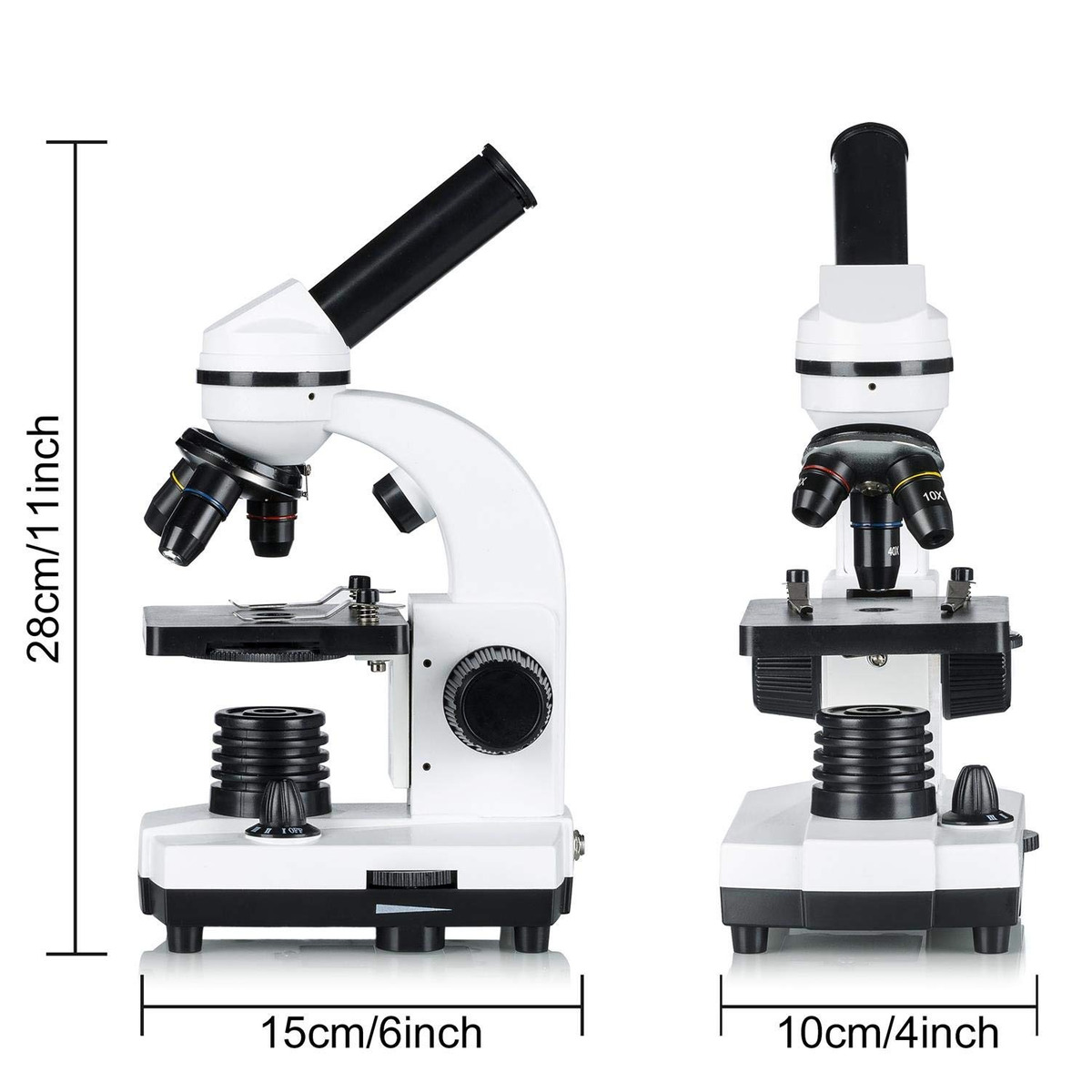 Orientado hacia delante rotación torreta proporciona 40X, 64X, 100X, 160X, 400X, 600X de ampliación .; Monocular cabeza con parte superior y parte inferior LED y la iluminación del espejo de visión; Microscopio para niños: parte inferior de goma antideslizante y Estructura de construcción ABS con estadio y clips; enfoque macrométrico coaxial tiene un mecanismo de enfoque de cremallera y piñón en un marco de ABS blanco durable y fashin; cristal óptico K9; Microscopios para estudiantes con kit de accesorios, buenos regalos para sus niños y principiantes. DQQ Microscopio educativo para los estudiantes de los niños 40X-640X-6 potencias de aumento superior e inferior LED, kit de accesorios de diapositivas