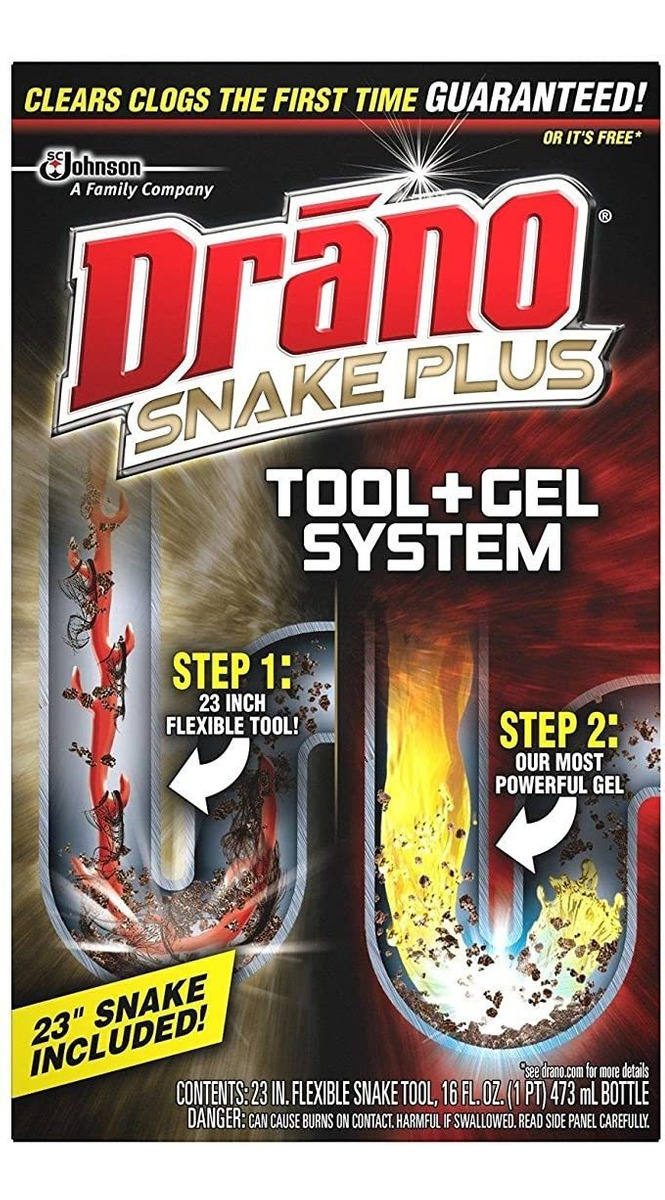 Drano serpiente Plus de drenaje de kit de limpieza es una solución simple de dos pasos para desatascar el desage. Drano emparejado una herramienta flexible de 23 pulgadas con su más potente gel para limpiar la boca del desage primera vez garantizado o su libre. Utilice la herramienta de la serpiente para golpear zuecos sueltos, y luego verter Drano Max Gel Clog Remover por el desage para eliminar la obstrucción de distancia. El gel se vierte directamente a través de agua estancada y trabaja rápidamente para restaurar el drenaje a un estado de flujo libre. Drano serpiente Plus es duro para el cabello, espuma de jabón, y otra suciedad, pero seguro para todos los tubos. Zuecos suceden, pero con Drano usted y sus desages son imparables. Todos nuestros productos estan en inglés SKU 4032113613