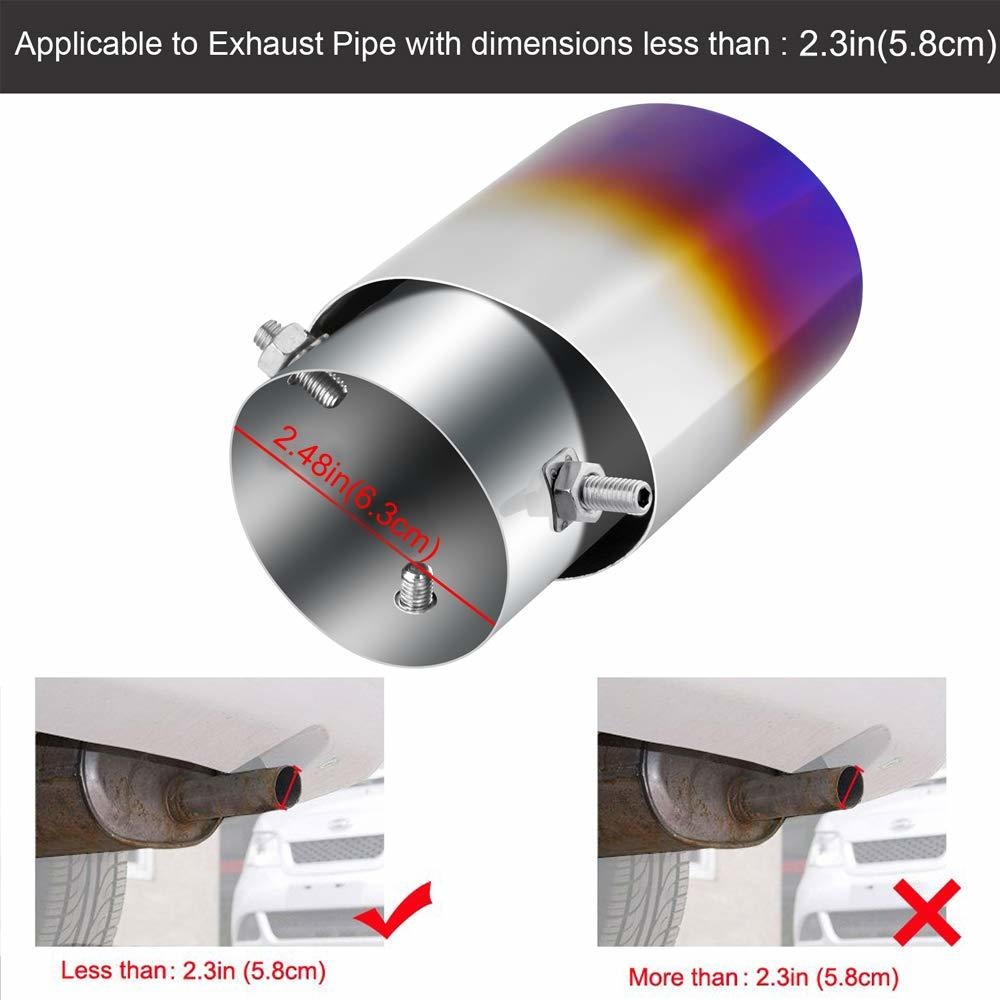 ¿Nota 1 agrandar Esto Tip adapta Tubos de 1 1/2 de pulgada a 2 1/4 pulgadas diámetro de la tubería. Por favor, medir su diámetro de la tubería .; ¿Nota 2¿ Por favor, compruebe el tipo de su tubo de escape originales. tubo de escape recto es para el tipo lineal, y el tubo de escape es curvado para el tipo curvado .; ¿¿ Nota 3 Ver imagen más detalles del producto, Comprender la instalación y el tamaño del producto, puede ver los otros productos de tubo de escape siete, elegir el tamaño del producto correcto y su color favorito .; ¿¿ Fácil de instalar No hay necesidad de sustituir las piezas, no necesita soldar. Sin taladro needed.Super fácil de instalar! Dos perno encaja la punta a su tubo .; ¿¿ Decoración del coche + pulido de la superficie a la plancha proceso de azul. Ejecución exquisita, brillante brillante y colorido fresco del neumático del coche tapas de vástago de válvula colors.Extra 4Pcs como regalo. Todos nuestros productos estan en inglés SKU 601204624