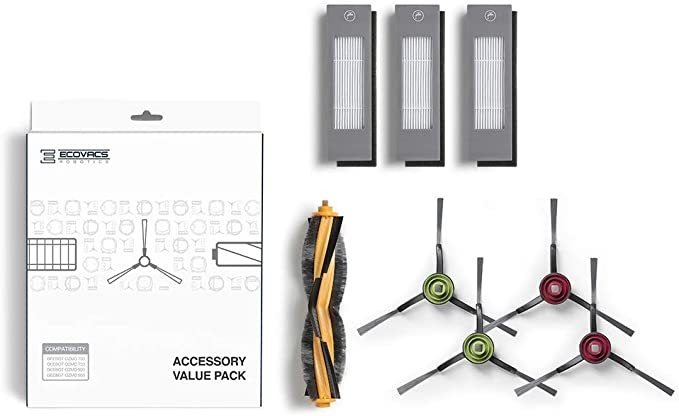 Incluye 1 cepillo director, 4 Cepillos laterales y 3 Filtros de Alta Eficiencia; Compatible con la aspiradora robótica Deebot Ozmo 920/950 / T5 / T8 / T8 AIVI y limpiador de mopa; ECOVACS Robotics Recomienda change El Cepillo director vez una, cepillos laterales Dos Veces y Filtros 3 Veces al año; Sin Montaje Requiere Kit de accesorios de repuesto deebot OZMO920 y OZMO950. Todos nuestros productos estan en inglés SKU 19052122693