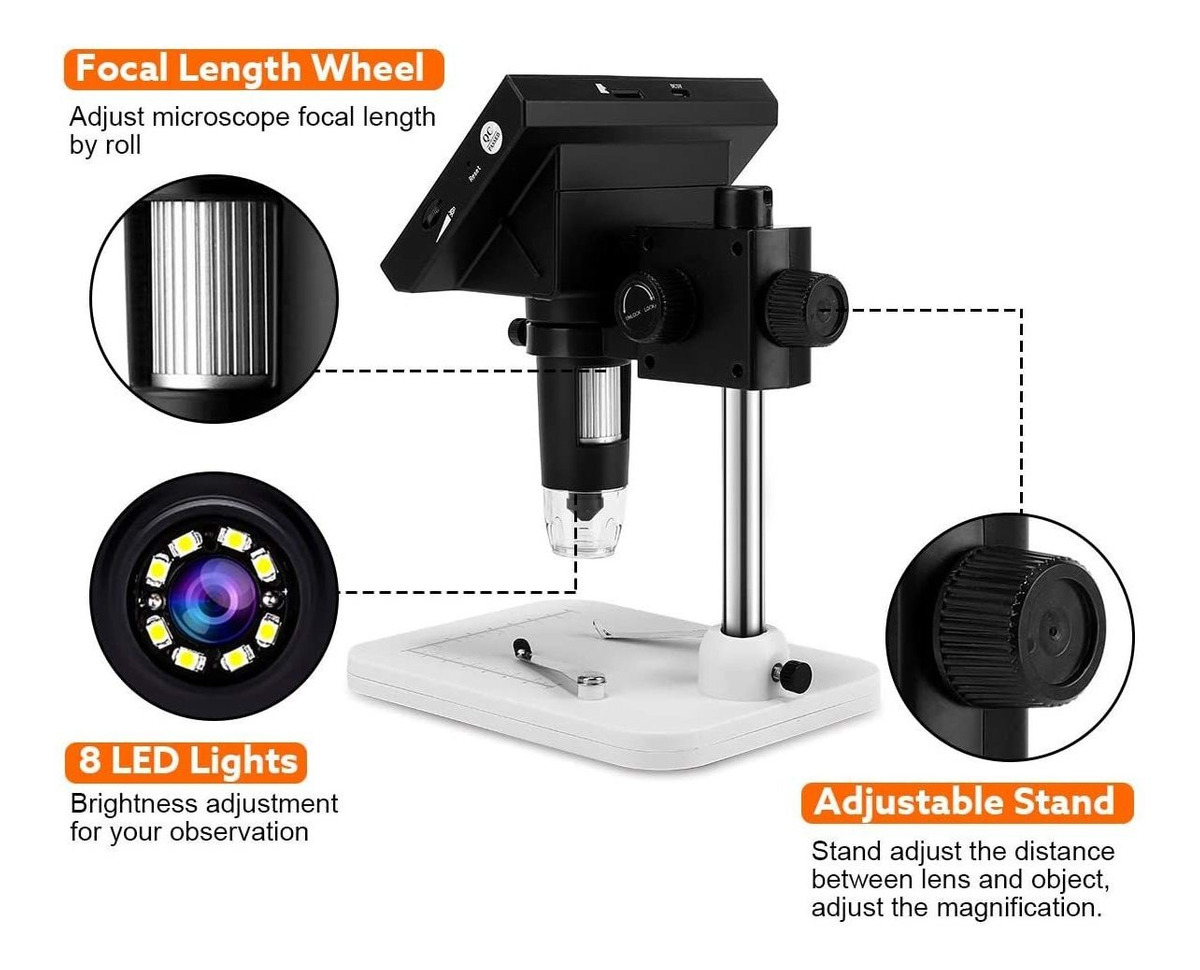 LCD Pantalla de 4,3 Pulgadas: el microscopio te permite ver al instante Todas tus Observaciones en detalle y te proporciona Una visión de Resolución de 720P / VGA .; Aumento continuo de 500-1000X: el microscopio digital de Viene con prismáticos proporciona aumentos de 50X-1000X, el microscopio también utilizació 8 Técnicas de Iluminación LED ajustables para Aumentar el detalle o el contraste .; Soporte ajustable: el Alcance PUEDE Ajustar el Aumento y La Distancia Entre la Camara Y el Objeto por el Controlador, lo que hace Que Lo utilice Más convenientemente .; Soporte de Tarjeta Micro SD de 32 G (sin Incluida): digital LCD el microscopio Equipado con ranura para Tarjeta micro TF, imagenes y vídeos obtenidos Durante tus Observaciones Guardados En Una Tarjeta TF y los Salida a Través de Conexiones USB .; Uso Amplio: Este microscopio digital de Se Puede Como utilizar en Amplias Aplicaciones, cuentos de Como OBSERVACIÓN al aire libre, detection de Aprendizaje, distinguir Entre verdadero y falso, identification de joyas, detection de impresión, reparación de placa de circuito. CARACTERISTICAS: