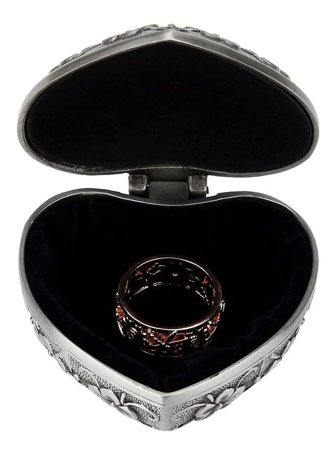 Hecho de la aleación de zinc de larga duración sólido que tiene la apariencia de estaño caro .; Adecuado para almacenar los pendientes, anillos u otras joyas pequeña; Buen regalo para sus seres queridos para cumpleaños, aniversarios, Día de la Madre, Día de San Valentín, Navidad, también una caja de joyería perfecto para poner sus joyas preciosas; La forma del corazón, exquisita hand grabado alrededor de la superficie .; Adecuado para pequeños obsequios como anillos, pendientes, collares u objetos pequeños como botones. Descripción: