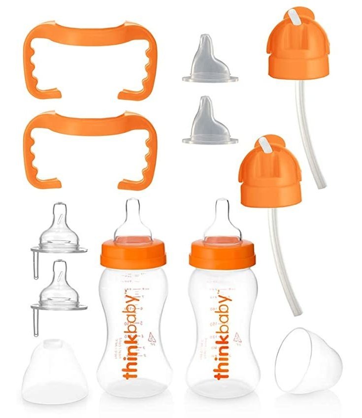 Libre de BPA, plomo, PVC, nitrosaminas, ftalatos, melamina y biológicamente nocivas sustancias químicas; Todo-en-uno juego viene con 2 pezones Etapa A, 2 pezones Etapa B, 2 9 oz bases de botellas, 2 tapas de viaje, 2 caños Etapa C para sorber, 2 tapas Etapa D Thinkster; Transiciones con las necesidades del niño desde el nacimiento hasta 4 años de edad a salvo sobre los residuos del medio ambiente no hace falta; Pezones hizo con nuestro diseño de corte transversal anti-cólico que imita la lactancia natural, cimas de viaje prevenir derrames y protegen del contacto con sustancias extrañas Los thinkbaby Todo en un conjunto comienza con una base de botella que se transforma en el Sippy y luego de nuevo en el Thinkster. Con los tipos de tapa ajustable, se deduce que su bebé desde recién nacidos hasta de 4 años de edad. Libre de BPA, ftalatos, nitrosaminas, plomo, PVC, PET, y los productos químicos biológicamente nocivas. El All-In-One viene con: dos pezones Etapa A para 0 a 6 meses, dos pezones Etapa B durante 6 a 12 meses, dos 9 oz bases de botellas hechas de polipropileno, dos tapas de viaje, dos asas Sippy, dos canalones Etapa C Sippy de 9 a 24 meses, y dos Etapa D Thinkster encabeza durante 18 meses en adelante. Las tetinas de los biberones están hechos de silicona suave, de grado médico, y son de corte transversal a la lactancia materna natural de sinóptico. Este diseño único ayuda a reducir los gases, escupir, y los casos de cólico. cimas de viaje evitan que material extraño entre en contacto con la superficie de la tetina del biberón, y reduce el derrame. Las rótulas superiores Thinkster de protección así. Lavar en el lavavajillas, la rejilla superior recomendado, y fácil de limpiar. Perfecto para las duchas del bebé o regalos del registro. Todos nuestros productos estan en inglés SKU 13082008137