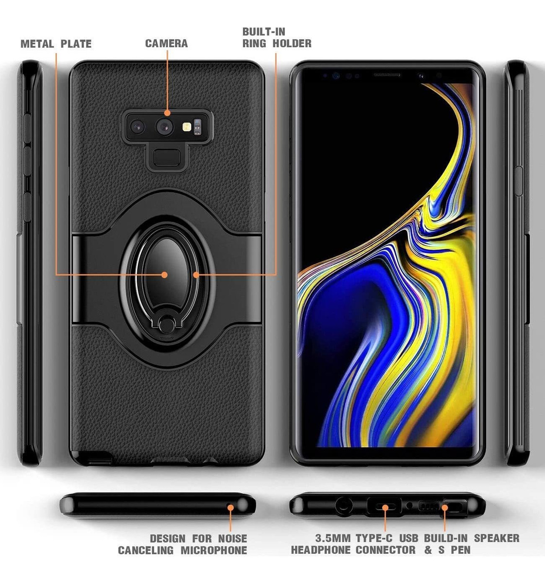Soporte de anillo integrado: no te preocupes más por que tu gran tamaño Note 9 se caiga cuando estás haciendo operaciones con una sola mano. Nuestro soporte de anillo integrado está hecho de aleación de zinc de alta calidad que es resistente para el uso diario. Pasar a través del bucle con el dedo anular, proporciona un agarre cómodo y seguro cuando se opera con una mano. También ayuda a evitar que tu teléfono móvil se caiga.; Funda de soporte: anillo giratorio de 360 grados que se dobla como un soporte de anillo o un soporte. Se puede girar y girar para una experiencia de visualización manos libres. Con la placa de metal integrada, el fuerte soporte magnético para coche hace un gran contacto con tu Note 9 y evita resbalones durante los paseos con baches. Nota: Por favor, retira esta funda cuando utilices un cargador inalámbrico como la placa de metal y el soporte de anillo.; Potente soporte magnético para coche: cuatro potentes imanes integrados proporcionan una fuerte sujeción de teléfono de seguridad, que puede alcanzar hasta 9 oz de peso máximo. Es fácil de sostener la mayoría de teléfonos y dispositivos GPS. El adhesivo 3M VHB de alta calidad puede soportar temperaturas extremas y no se derrite.; Funda de diseño delgado: cuerpo de piel texturizada que absorbe los golpes con marco rígido que proporciona una protección completa para un uso prolongado. La construcción ajustada a los impactos sigue siendo delgada y fácil de usar. El perfil delgado también permite un funcionamiento con una sola mano con teléfonos inteligentes Note 9. Los recortes precisos garantizan un fácil acceso a S Pen, cable de carga y auriculares.; Compra sin preocupaciones: todas las fundas de eSamcore Galaxy Note 9 y soportes de coche han sido 100% probados con control de calidad. Obtendrás una garantía de devolución de dinero o reemplazo del 100% si ocurre daños. Por favor, póngase en contacto con nuestro amable servicio al cliente ya que estamos disponibles para ayudar las 24 horas/7 días a la semana. Todos nuestros productos estan en inglés SKU 91221081598