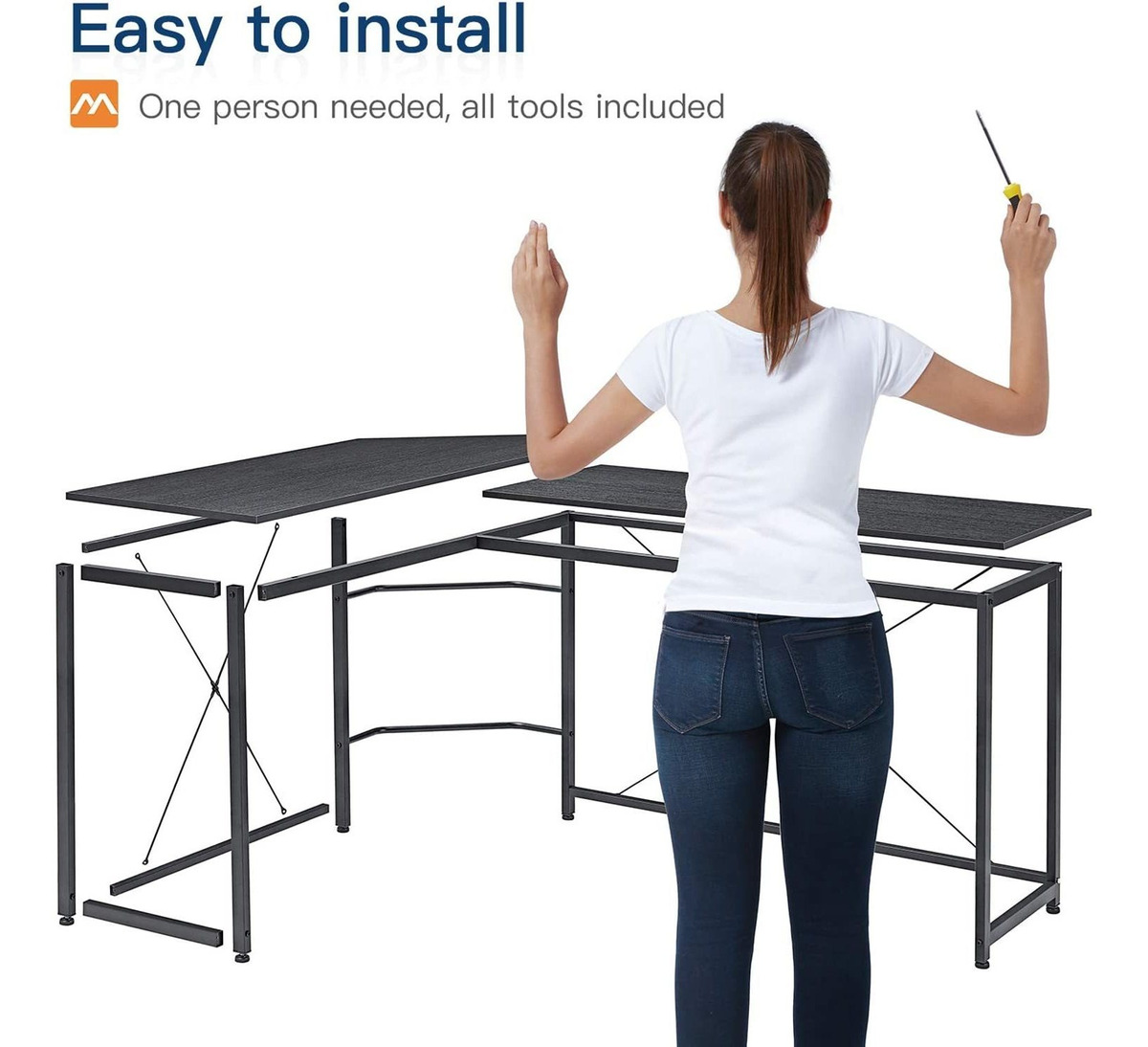 L-Shaped Corner Design: The gaming computer desk fits nicely in a corner and maximizes your home office workspace perfectly. Allows you to take the advantage of your room corner as the best spot for work.It is also a good choice to make it as your gaming workstation.; Large Size Ample Space: 66.1(L) x 47(W) x 19(D) x 28.5(H). Large space for a computer desk, great choice for home office activity, gaming and writing work. Desk Height: 28.5. Plenty of leg room for rest and for storage.; High Stability Super Sturdy: The legs of the desk have two diagonal braces to ensure the stability. Strong steel frame ensures the maximum durability and stability, and can hold up to 220 lbs. Steel legs and adjustable leg pads keep the table stable on uneven floors.; Easy to Assemble Large Desk Panel: A detailed instruction manual and a screwdriver are provided. Desktop made of MDF (Wooden Medium Density Fiberboard), is waterproof and anti scratch, very easy to clean.; Note: For a smooth assembly process, we suggest you keep a lite tightness for all the screws during assembly, after the whole desk is assembled, firmly tighten all the screws. If you have any problem regarding our product, please contact us, our customer service team is happy to serve you. Todos nuestros productos estan en inglés SKU 91221011094