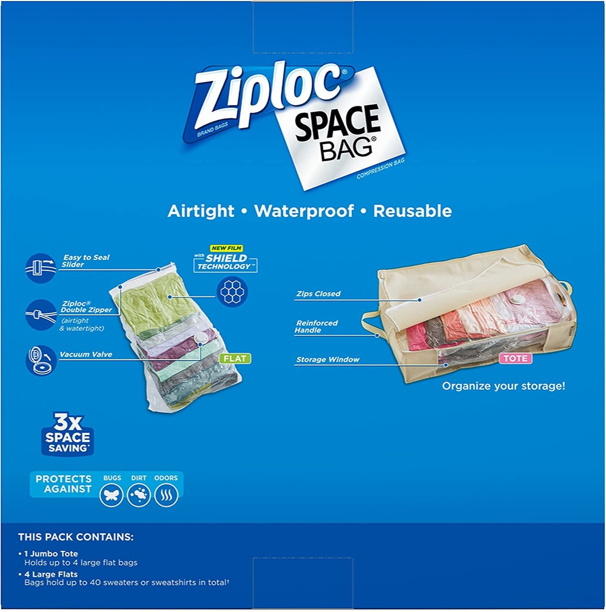 Bolsa Ziploc Espacio bolsas de almacenamiento son la marca líder en almacenamiento al vacío. Triplicar su espacio de almacenamiento con productos Bolsa Ziploc espacio, disponibles en una variedad de formas y tamaños. Hermético y resistente al agua, estas soluciones de almacenamiento creativas son perfectos para su hogar o de viaje. Todos nuestros productos estan en inglés SKU 6102024118