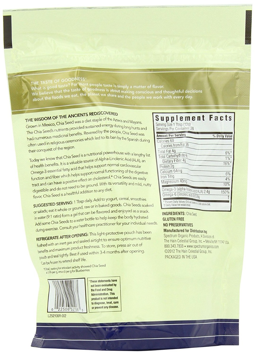 las semillas de chía enteros, una fuente inagotable de nutrición utilizada por los antiguos aztecas y los mayas; Una buena fuente de ácido ALA omega-3 grasos esenciales que ayuda a la salud del corazón de soporte; 4 gramos de fibra dietética por porción; Mayor actividad antioxidante que los arándanos; sabor neutro significa semillas de chía se pueden mezclar fácilmente en batidos o sus otros alimentos favoritos sin afectar el sabor Sabor: Whole Chia | Tamaño: 12 onzas