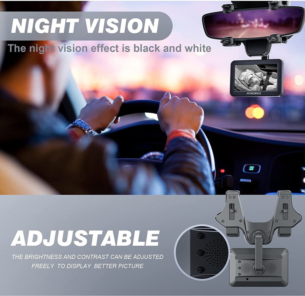 Seguridad de conducción: el monitor se puede instalar bajo el espejo retrovisor, y puedes ver claramente a tu bebé mientras miras el coche desde atrás. No hay necesidad de tomar el espejo retrovisor para ver a tu bebé, lo que mejora la seguridad de conducción y te ayuda en gran medida a centrarte en la conducción.; Cámara de coche para bebé de 1080p: la cámara de espejo de coche para bebé utiliza tecnología 1080p. La imagen de resolución HD de 1920 x 1080P en nuestro monitor actualizado de 4,3 pulgadas te permite ver a tu bebé mirando hacia atrás en el asiento trasero del coche más claro cuando conduces.; Visión nocturna mejorada: el monitor de bebé para coche tiene una cámara de 8 luces LED infrarrojas con función de visión nocturna, proporciona una visión clara incluso cuando se conduce en la noche oscura sin ninguna luz. Puedes ajustar el brillo y el contraste como quieras.; Fácil instalación: monta fácilmente el espejo del coche del bebé en el reposacabezas en cuestión de minutos; no necesita herramientas, instala el monitor LCD bajo el espejo retrovisor, conecta el cable de alimentación al encendedor de cigarrillos, entonces funcionará. El monitor LCD se encenderá automáticamente y cambiará al asiento trasero del bebé. El encendedor de cigarrillos de 12 V es adecuado para la mayoría de los modelos de coches.; Ajustable y estable: rotación de 360 grados entre pantallas horizontales y verticales a tu voluntad para un mejor ángulo de visión. La cámara se puede inclinar hacia arriba y hacia abajo 130 con una lente gran angular de 150 para apuntar al bebé. El soporte del monitor es firme, no hay necesidad de preocuparse por que se caiga durante la conducción. Todos nuestros productos estan en inglés SKU 91221084251