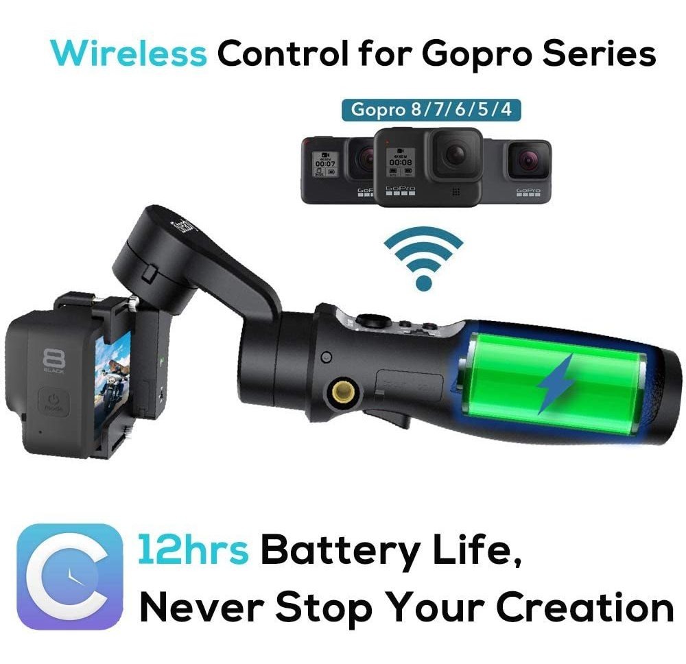 Ligero y portátil para su Viaje, Ninguno de agitar Hecho de la última tecnologia de Compuestos de Polímero Que Será Mucho Más Ligero Que Otros cardán GoPro. Responde A Cada movimiento delicado sin ningún RETRASO. Fácil de Operar con la palanca de mando y Un recentrado Button. Proporciona Una Grabación de vídeo A Nivel De Película, di adiós a los borrosos .; Diseño de ángulo biselado El diseño en ángulo de 30 en el motor de rodillo con el Brazo de Soporte Más Largo, Haciendo Que la Cámara de acción de Visualizacion de obstrucción Libre y siempre en su Línea de visión para Capturar Lo Que DESEA Sin límites. El motor de giro es Capaz de Girar 360 ONU completo Para Hacer ONU Increíble efecto de inicio .; 12 Horas de Tiempo de Funcionamiento, Chagres para la Cámara Batería Integrada 4000 puré proporciona 12 horas de Largo Tiempo de Funcionamiento, Permite suministrar un sector energía Otros Dispositivos Como un banco de Energía. Se Configura con Micro USB / Tipo C para Cámaras de Acción. Con Múltiples Puertos de 1/4 de pulgada, PUEDES ampliar Otro Dispositivo O USO, Como montarlo en la bicicleta o trípode .; lapso de tiempo de movimiento, 360 Panorama Captura El tiempo en TU IMAGEN / vídeo! El estabilizador de cardán PUEDE ayudarte un Disparar Una foto / vídeo de lapso de Tiempo Con Un panorama suave, simplemente libera tus manos. Y es hora de Decir Adiós un LAS FOTOS PANORAMICAS borrosas, rotas y deformadas, PUEDES Capturar facilmente ONU panorama estable de 180 / 360 nuestro de la estafa estabilizador de cardán GoPro .; Diseño a prueba de salpicaduras, perfecta COMPATIBILIDAD, 1 año sin Preocupaciones. Con el diseño a prueba de salpicaduras, Logra ONU Rendimiento a prueba de salpicaduras y polvo. No tendras Que preocuparte por tus crear de Programas de Vídeo En un lluvioso día. Funciona con DJI OSMO Acción, GoPro héroe 8/2020, Hero 7 / héroe 6, HERO5, Hero4, HERO3 , HERO3, Yi 4K, AEE, SJCAM y Otras Cámaras de Acción Que Tienen Dimensiones SIMILARES. Especificaciones: