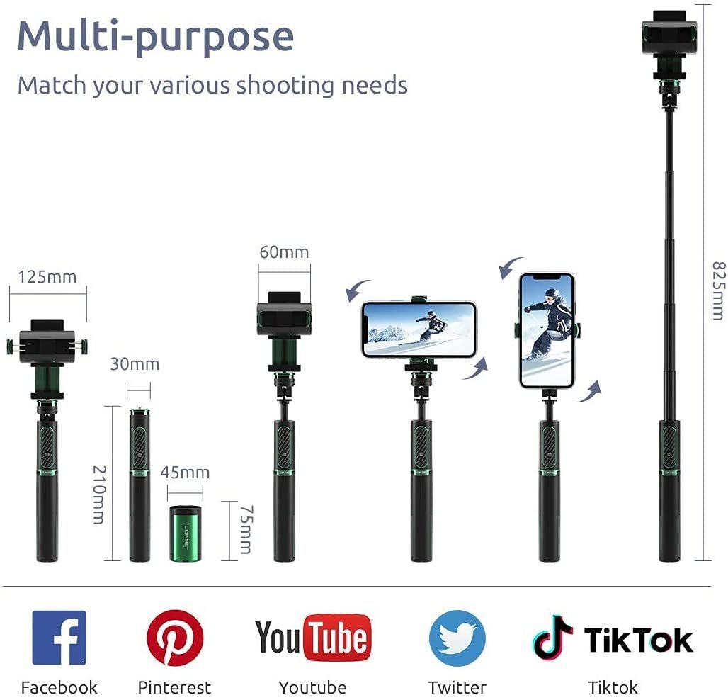 Diseño compacto todo en uno: soporte de rotación ajustable de 90 y soporte giratorio de 360. El palo selfie Lofter con trípode también tiene función estabilizadora. Si lo mueves arbitrariamente, la función de estabilización puede sostener el teléfono paralelo a la línea horizontal. Como estabilizador de cardán con equilibrio automático que hace que tus disparos sean más suaves y más estables. También se puede utilizar como un trípode selfie stick con mando a distancia; Palo selfie portátil y trípode integradoComo el palo selfie portátil, el más largo se puede tirar hasta 32.5 in, lo que hace que tomar selfies y fotos de grupo sea más agradable. Diseño ingenioso, con el que el trípode reforzado se puede abrir o cerrar a la vez, como modo de mango o modo trípode. La distancia máxima de funcionamiento del mando a distancia Bluetooth extraíble (integrado en el palo) es de 32.8 ft, lo que nos permite tomar más diversas formas de tomar fotos.; Compatible con la mayoría de los smartphones: el estabilizador portátil Lofter es compatible con casi todos los teléfonos móviles. Como los teléfonos inteligentes Android e iOS, siempre y cuando tu teléfono tenga un ancho de 1.614-4.921 in. Por ejemplo, iPhone, Google Pixel/Nexus, Samsung, Huawei, Oneplus, Xiaomi, Redmi Note 4x, / Note 3; LG G6/G5; Smartisan NUT Pro 2/U1 Pro; Oppo R9s, Vivo X7, etc. Y otros dispositivos con conexión de tornillo de 1/4, como GoPro, cámara de acción, cámara digital, luz de anillo selfie; Excelente rendimiento de la batería La duración de la batería del estabilizador de cardán LOFTer es de hasta 12 horas y se puede utilizar continuamente durante 3-4 horas. Cuando la batería está baja, puedes alimentar el estabilizador con un banco de energía portátil para extender la vida de la batería. Todo lo que necesitas es una carga de 2 a 3 horas. Simplemente carga el mando a distancia Bluetooth a través de micro USB (aprox. 30 minutos). Puede tomar 1000 fotos.; GarantíaCertificado de seguridad CE y ROHS. El paquete incluye: 1 trípode para palo selfie, 1 mando a distancia inalámbrico, 1 manual de usuario (idioma español no garantizado) Todos nuestros productos estan en inglés SKU 91221077807