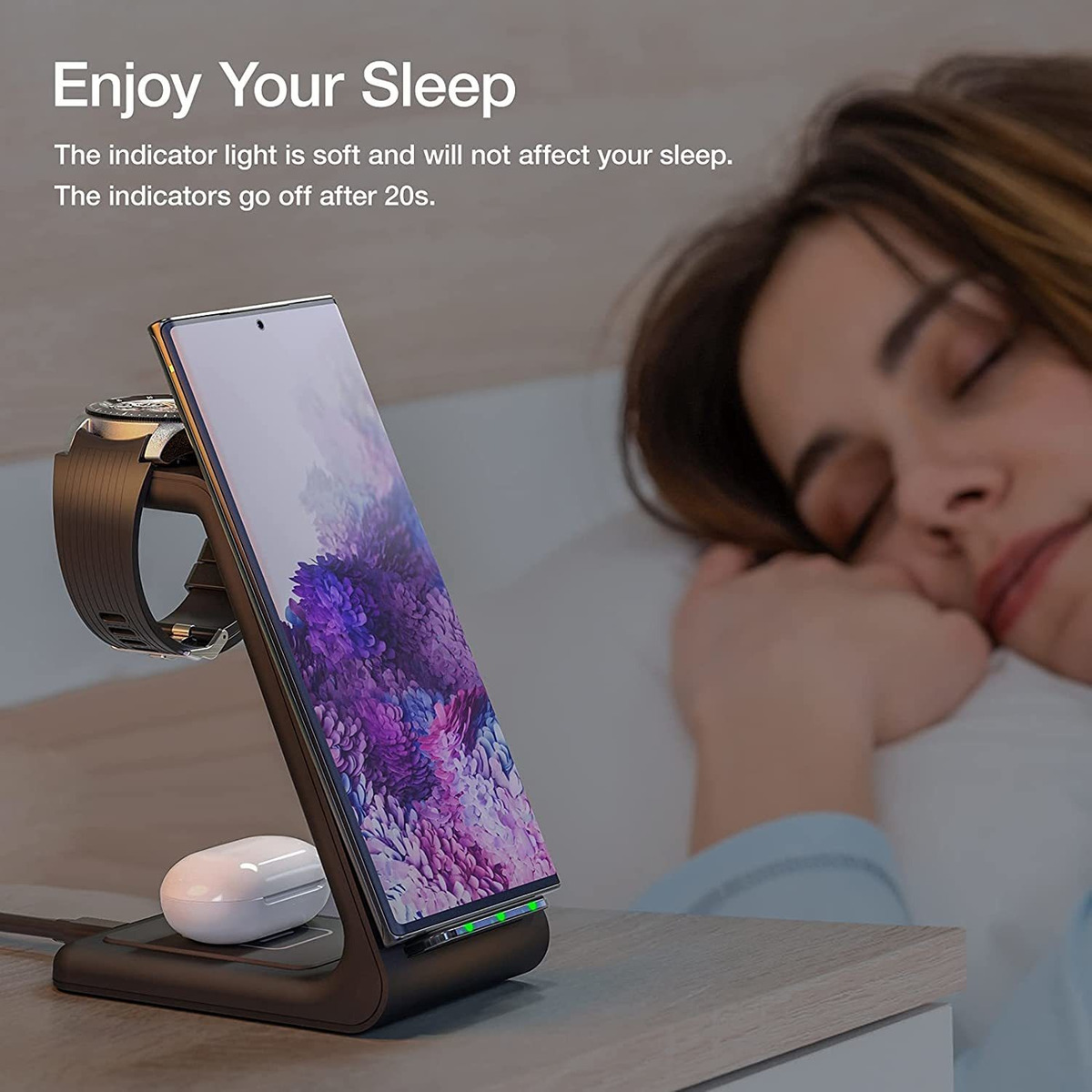 Cargador todo en uno para Samsung El cargador inalámbrico para Samsung con tecnología avanzada soporta el teléfono Samsung, el reloj y los auriculares de carga simultáneamente. Para la salida estable del cargador, utiliza el adaptador QC3.0 de 18 W cuando se cargan 3 dispositivos al mismo tiempo. Adaptador incluido; Compatibilidad universal La base de carga puede resolver fácilmente tu problema de carga multidispositivo. Modelo de carga de 10 W para Samsung teléfono Z Flip3/S21/S20/S10/S10/S10 e/S8/S8/Note 20/10/8/7, modelo de 5 W para Galaxy Buds / Buds /Buds Live y otros teléfonos Qi-habilitable, modelo 3 W para Samsung Galaxy Watch 4 (Classic)/Galaxy Watch 42/1.811 in/Galaxy Watch 3 41/2 1.772 in/Galaxy Active 1/2/Gear S3 Frontier. (Nota: no para Apple Watch); Diseño compacto y compatible con fundas Deja de lado el problema de quitar la funda del teléfono cada vez que cargas, el cargador inalámbrico puede cargar directamente el teléfono a través de una funda de teléfono por debajo de 0.3 pulgadas. La estación inalámbrica tiene un diseño compacto que ahorra espacio. Y equipado con una bobina de carga dual y un ángulo ergonómico de 65 que hace que tu teléfono sea fácil de usar en un estado vertical u horizontal, disfruta viendo películas, reconocimiento facial rápido.; Ultra seguro: el soporte de carga para Samsung está certificado por Qi que proporciona una función de detección de sobrecorriente, sobrecarga, sobretensión, sobretemperatura, así como de objetos extraños. La estación está hecha de material ABS que es resistente al fuego, te permite cargar más con facilidad. Vale la pena señalar que el cargador ha diseñado cuidadosamente algunos agujeros de refrigeración en la parte posterior, que pueden disipar rápidamente el calor y proteger tus dispositivos cuando se carga.; Disfruta de tu sueño e indicador LED El soporte de carga inalámbrico para Samsung tiene los indicadores para teléfono, reloj y auriculares por separado. Cuando está conectado, el indicador parpadea en verde 3 segundos y se apaga. El indicador estará sólido en verde cuando tus dispositivos empiecen a cargar y se apagará después de que el cargador cargue el dispositivo durante los 20 segundos. Todos nuestros productos estan en inglés SKU 91221081910