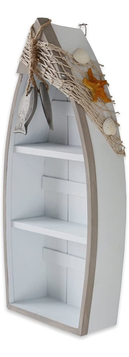Dimensions: 16.5 x 8 x 3 inches; Features three shelves, a beige fish net accent with rope,shell and fish star, and beautiful shades of gray and white; Perfect for any room; Made from MDF; Shelf dimensions: Bottom: 3 inches, Middle: 2 3/4 inches, and Top: 3 1/4 inches Cuenta con tres estantes, un acento red de pesca de color beige con una cuerda, Shell y estrellas de mar, y hermosas tonalidades de gris y blanco Todos nuestros productos estan en inglés SKU 6102030779