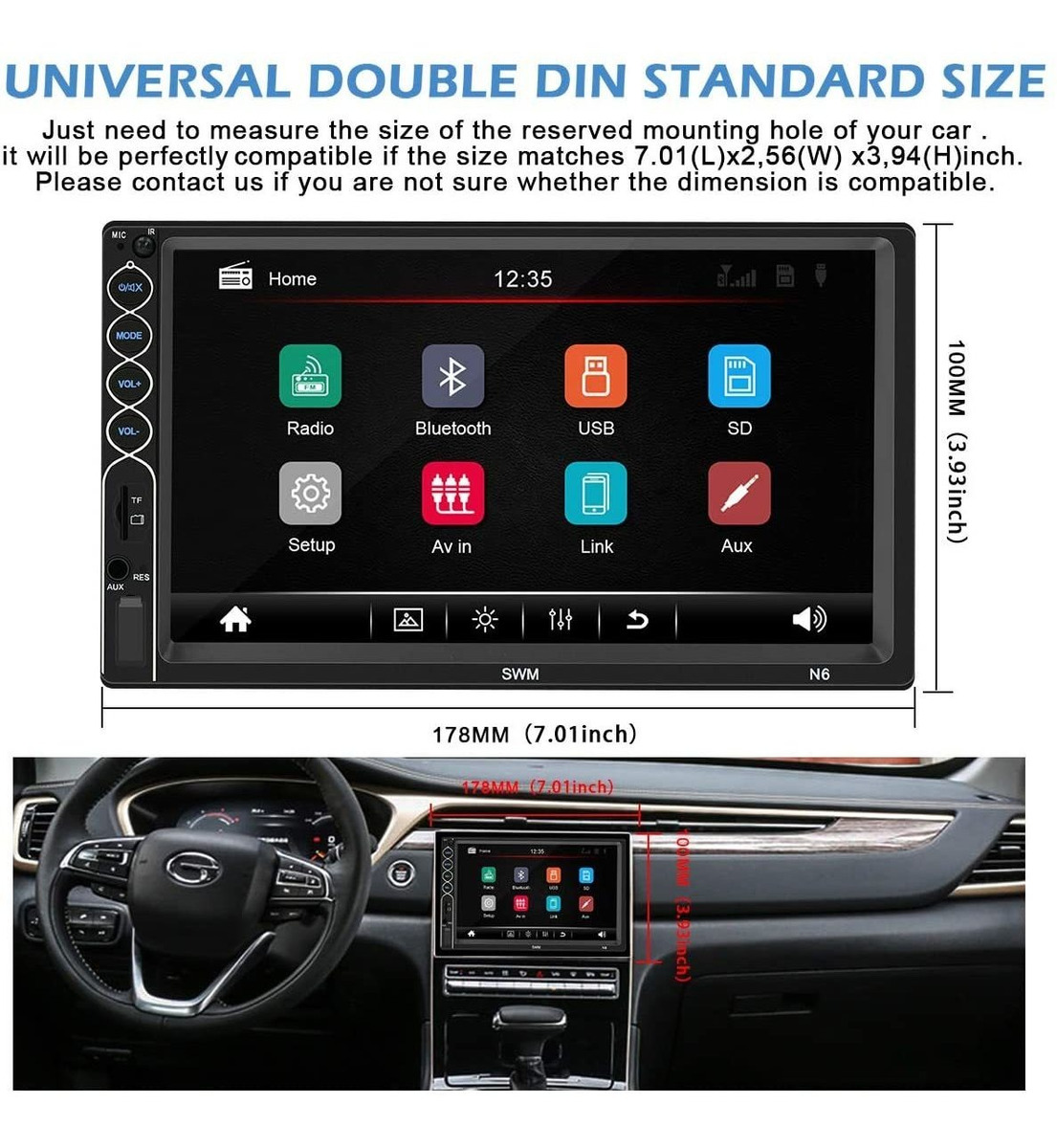Pantalla táctil Actualizada de Alta Resolución: Este estéreo this Equipado con Una Pantalla táctil LCD de Alta Definición de 7 Pulgadas, de alto contraste, clara, brillante y compatible con Resoluciones multimedia up to 1080P. La Pantalla táctil resistiva mejorada y Ajustada profesionalmente te offers de control Un Mas sensata y Preciso. Formato de vídeo compatible: RM / RMVB / DVD (VOB) / VCD (DAT) / MP1 / MP2 / DIVX / XVID / MP4 / H263 / H264 / FLV / 3GP / SWF / AVI / ASF / MJPEG, etc. Formato de audio : MP3 / WMA / WAV / MKV / FLAC / OGG / APE. Nota: Este no Es Un reproductor de CD / DVD .; Bluetooth Manos Libres y música: chip Bluetooth 4.2 mar de doble canal de integrated Con Mas Especificaciones Que hace Que La Señal Bluetooth más Reservas estable. Cuando El estéreo del coche se empareja con tu Teléfono un Través de Bluetooth, PUEDES Hacer Llamadas Manos Libres, Reproducir Música y Controlar. Conducir Es Ahora Más Seguro y Más conveniente .; Función de imagen inversa: equipada con Una exclusiva Cámara de marcha atrás de 12 ledes, Que proporciona visión nocturna Más Una clara. La Pantalla táctil de 7 Pulgadas mostrará automaticamente la imagen inversa Una Vez Que coloques el coche en marcha atrás. Haz que tu Inversión Diaria mar Más Segura .; Espejo de Teléfono: compatible con la Mayoría de Teléfonos Móviles (Android 9.0 y posteriores, iPhone 11, XR iPhone, iPhone 8 y posterior). A través del enlace de Espejo, el estéreo del coche mostrará el contenido de la Pantalla de tu Teléfono móvil de forma sincrónica. Enciende la Aplicación de navegación en tu Teléfono, podras Como utilizar la Función de navegación en tu coche MIENTRAS conduce. Nota: el reproductor estéreo sin Es Una Unidad GPS, obtiene la Función de navegación GPS Conectando al Teléfono móvil .; De Como Elegir el estéreo correcto para el modelo de coche: Este es estéreo universales de doble DIN. La Unica Sugerencia es comprobar v si la ranura de Instalación originales de su coche coinciden con 7,01 (L) x 2,56 x 3,94 Pulgadas (W) (H). Bajo el Tamaño de Instalación correcto, sin Habra Problemas de COMPATIBILIDAD En El USO. Bienvenido a contactar nuestro de la estafa servicio de Atención al cliente en Línea las 24 horas si Tiene Alguna Pregunta sobre la Instalación y el cableado. Principales características: