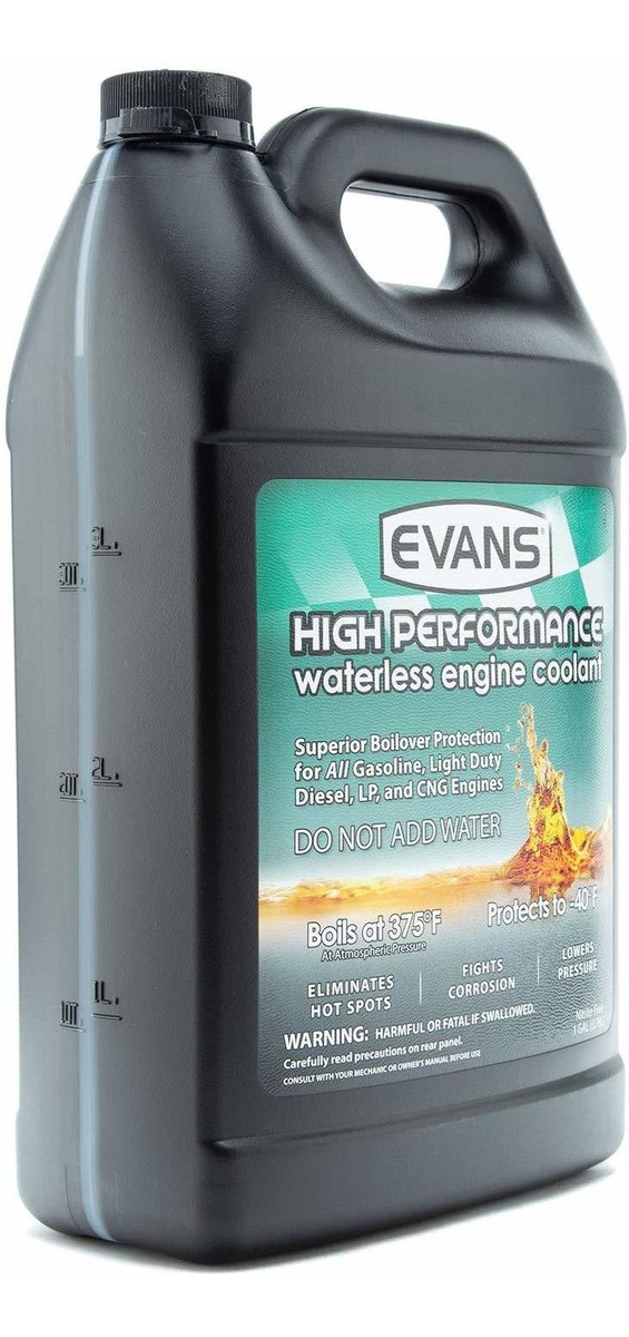 Evans alto rendimiento sin agua refrigerante del motor, EC53001, está diseñado específicamente para todos los motores modernos, clásicos y de época gasolina, diesel de poca potencia, LP y vehículos de GNC. Evans Alto Rendimiento de líquido refrigerante (HPC) defiende de ebullición y la corrosión sobre la vez que permite que el motor siga produciendo su potencia máxima. Cuando la conversión de un motor de un refrigerante basado en agua para HPC, el gran cuidado debe administrarse durante el proceso de instalación (conversión) para asegurar que todo el refrigerante viejo a base de agua y el agua se elimina antes de instalar HPC. Se recomienda que el sistema se purgó con Evans de preparación de líquidos antes de instalar HPC Cuando la instalación se haya completado, el contenido de agua del refrigerante debe ser no más del 3 por ciento para un rendimiento óptimo. Evans HPC refrigerante contiene un agente / amargante amargor. Evans refrigerante se hace orgulloso en los EE.UU.. Todos nuestros productos estan en inglés SKU 6012013547