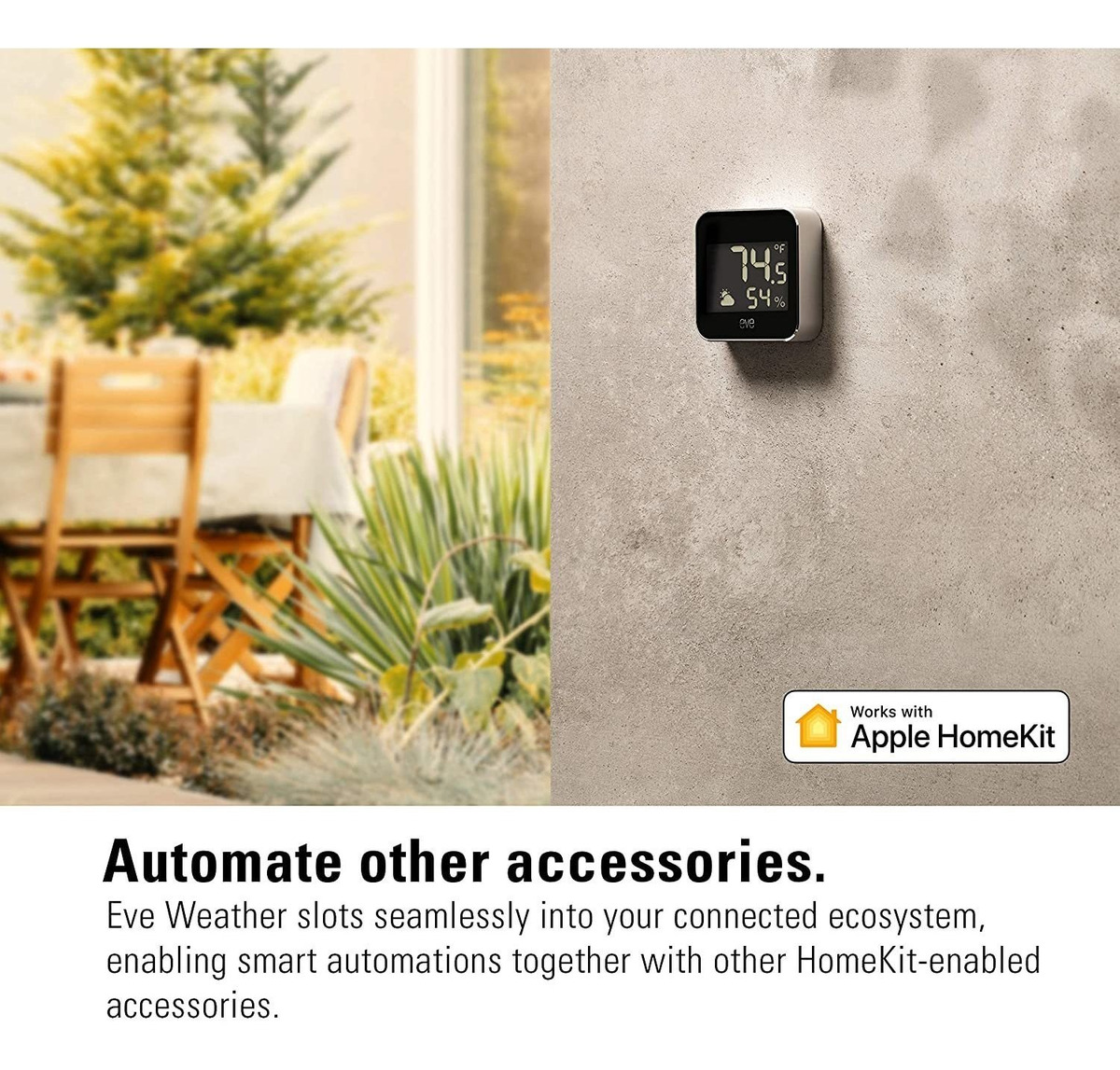 Seguimiento de temperatura exterior, humedad y presión barométrica a lo largo del tiempo y ver la tendencia meteorológica de un vistazo: en tu iPhone o directamente en la pantalla. Pídele a Siri el nivel de temperatura y humedad directamente en su puerta; Elegantemente fabricado con aluminio anodizado con resistencia al agua IPX3 y completamente inalámbrico con una batería reemplazable; HomeKit habilitado para una facilidad de uso sin igual y seguridad avanzada; ponte en marcha en un instante con una instalación rápida y fácil y sin necesidad de un puente o pasarela; Soporta Bluetooth y Thread, y se une a tu red Thread automáticamente. La rosca requiere un HomePod Mini como un router de bordes; 100% de privacidad: sin nube de Eve, sin registro, sin seguimiento. Inteligencia local y comunicación directa sin puente o dependencia de la nube. Nuestro equipo de soporte de productos altamente profesional y multilinge también está listo para ayudar Con Eve Weather, haz un seguimiento de la temperatura exterior actual, la humedad y la presión barométrica y ve la tendencia meteorológica de un vistazo, en tu iPhone o directamente en la pantalla. Revise los datos climáticos actuales y pasados, lo que le permite obtener información sobre el clima en su puerta. O pregunta a Siri cómo es la temperatura afuera, para que puedas vestirte para el tiempo del día antes de salir. Con un diseño elegante y sofisticado y resistencia a la intemperie IPX3, Eve Weather ofrece un funcionamiento verdaderamente inalámbrico y eficiente de energía con soporte para Bluetooth e Thread. Eve Weather se une a tu red Thread automáticamente y está habilitado para Apple HomeKit para una excelente facilidad de uso con iPhone, iPad y Apple Watch. Y lo mejor de todos los accesorios de Eve es cómo protegen tu privacidad: Eve no recoge tus datos personales y no hay nube de Eva, por lo que tus datos no se exponen. Todos nuestros productos estan en inglés SKU 15092117141