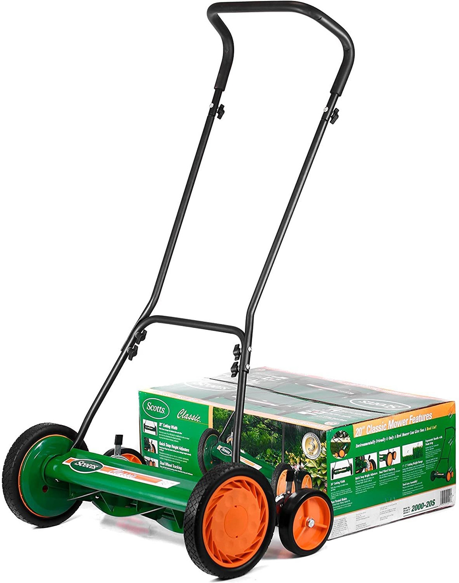 Light, maneuverable, economical. The Scotts 2000-20 Classic Push Reel Lawnmower handles thick turf with ease and provides a quiet, pollution-free solution for any lawn. The mowers dual tracking wheels and ultra-sharp steel blades ensure easy, accurate cutting and efficient operation. Powered by you, the mower has a wide cutting path and quick-snap height adjusters that ensure effortless operation and keep you in complete control of your grass height.