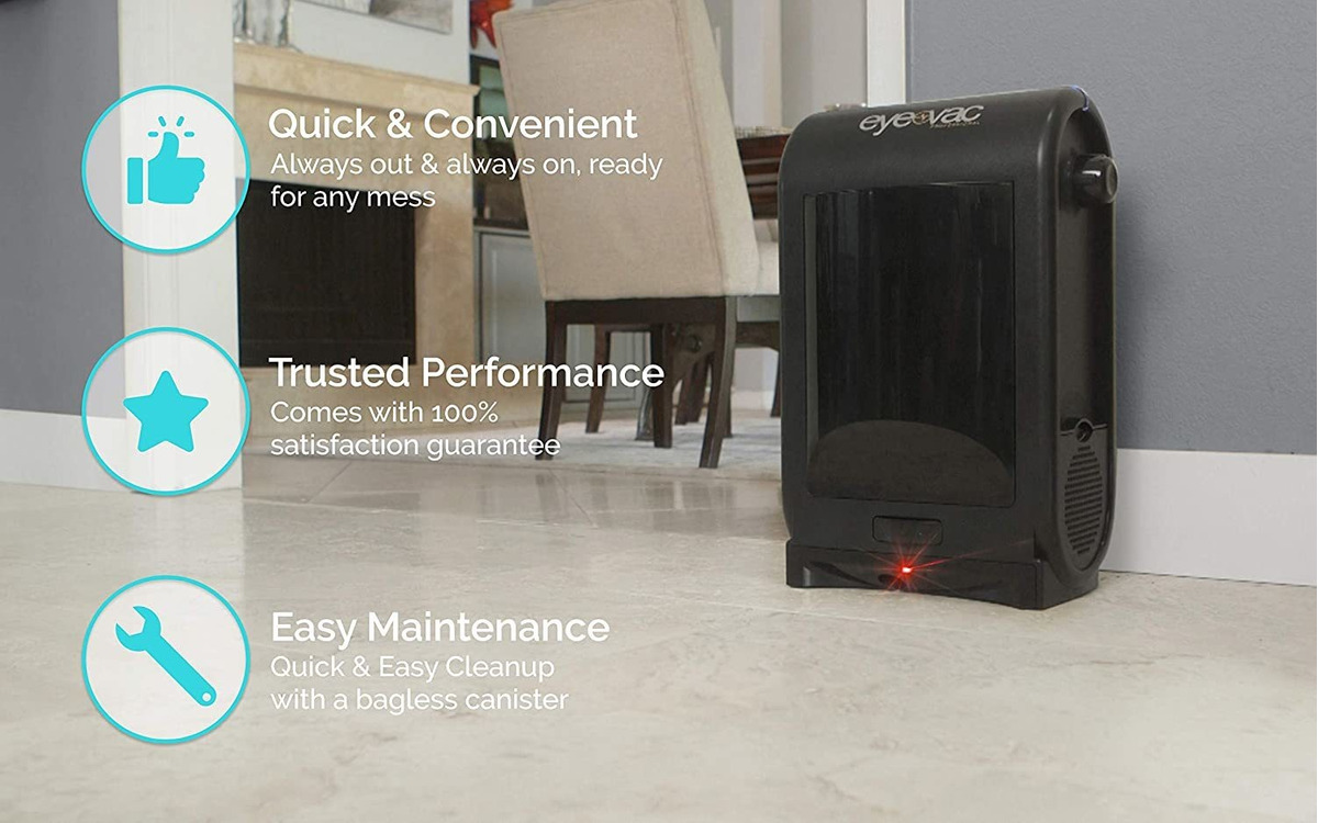 FAST POWERFUL: 1400 watt vacuum removes 100% of dust, hair and debris instantly; CONVENIENT: always on and always ready infrared sensors activate Eye Vac automatically; PERFECT FOR PROFESSIONAL USE: the EyeVac is ideal for commercial use including hair salons, boutiques, hospitality, kitchens and small businesses; HIGH EFFICIENCY FILTERS: equipped with 2 high efficiency filters, the EyeVac removes dust, dirt and debris from the air and returns clean air to the environment.; TOUCHLESS OPERATION: infrared sensors detect the sweeping motion and automatically activate the EyeVac, making cleaning easy. Todos nuestros productos estan en inglés SKU 91221089208