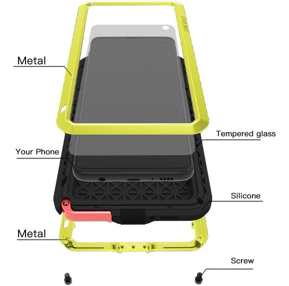 Compatibilidad: diseñado para encajar perfectamente con Samsung Galaxy S10 Plus 6.4 pulgadas 2019 solamente, no es compatible con Samsung Galaxy S10/S10e. El diseño especial de la carcasa del teléfono protector de parachoques hace que tu teléfono se vea más único y atractivo.; Materiales de grado profesional: cristal Gorilla, fijación frontal de seis tornillos, TPU de calidad, aleación de zinc, agujero reservado, hebilla de metal para auriculares. La cubierta de aluminio y cristal proporciona una buena protección para tu desviación contra arañazos, golpes, suciedad, desgaste diario.; Fuerte protección: con Gorilla Glass, la funda es a prueba de golpes, polvo, suciedad, nieve y agua cuando estás en deportes al aire libre como escalada, senderismo, camping, aventura al aire libre. Gran producto para los entusiastas del aire libre.; Diseño voluminoso: esta funda es pesada pero resistente. El peso es de 9.88 oz. Ten en cuenta el peso antes de comprar. Asegúrate de comprobar los tornillos cada mes para que no se aflojen. Protección extrema y muy duradera.; Gran regalo: esta bonita funda puede ser un regalo especial para tu familia, abuelo, padre, hermano, compañeros de clase, amante o para ti mismo en eventos especiales, como cumpleaños, día de Acción de Gracias, Año Nuevo, etc. Fácil acceso a todos los botones, puertos, cámara, altavoces y conector. Práctico y fácil de instalar. Color:Amarillo