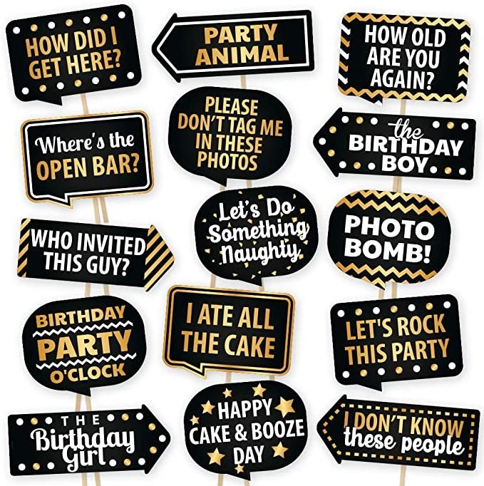 Foto del cumpleaños BOOTH APOYOS son el perfecto refuerzo fiesta de cumpleaños. Convertir cada autofoto de cumpleaños en una experiencia divertida para compartir y recordar. Estas decoraciones de la fiesta de cumpleaños divertido apoyos autofotos son un gran regalo y se involucrarán incluso las personas más tímidas .; FÁCIL DE MONTAR puntales de la cabina de fotos de cumpleaños. Todos los apoyos autofoto la foto del cumpleaños están equipados con tiras adhesivas de la cinta fuerte adicional de doble cara que con seguridad les atribuyen a palos largos y fuertes. palos cuadrados aseguran un mejor agarre de los redondos .; APOYOS DE ALTA CALIDAD DEL PARTIDO están hechas de cartulina resistente de gran tamaño haciendo que sean fáciles de leer en imágenes. Cada kit viene con stand fuerte 12in largos palos de madera que son fácil de sujetar. Apoyos se imprimen con tinta de alta calidad para los colores vivos .; Diseño lindo y un embalaje seguro. Estas fuentes de los apoyos autofotos cumpleaños son grandes regalos para los partidos tanto en hombres como en mujeres. Todos los cortes se pueden doblar como juegos de mesa / decoraciones así. Usted puede mezclar y combinar estos signos con los apoyos de la cabina corresponde con Photo .; PARTYGRAPHIX PhotoBooth APOYOS están diseñados y fabricados en Europa por nuestro pequeño negocio familiar. Prometemos que todos nuestros clientes una garantía de satisfacción del 100% con el apoyo puntual y completa. En caso de cualquier problema, apenas nos envía un mensaje! Color: Negro y Oro | Paquete Cantidad: 15