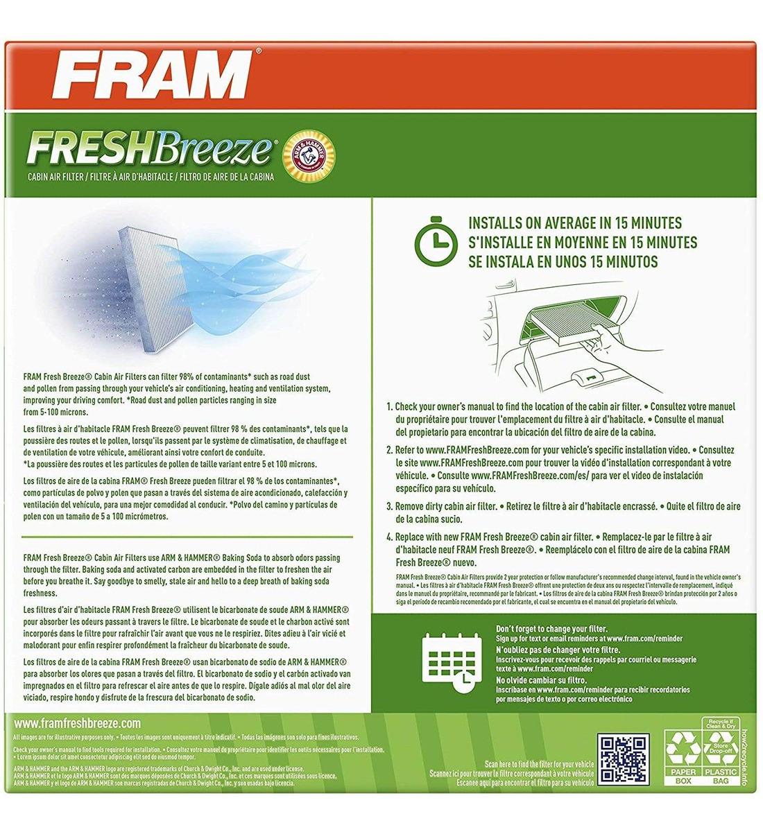 Proporciona Más Flujo de aire para mejor ONU Rendimiento .; Filtra el 98% el polvo de carretera y del polen, Que van from los 5 Hasta los 100 micrones, y ayuda a Proteger la Calefacción y las unidades de Aire Acondicionado .; El filtro de aire de cabina FRAM y El Brazo Y El Martillo Combina SUS Tecnologías para proporcionar la ONU Filtrado de aire de cabina de Máxima Calidad y Ayudar a Evitar la Formación de olores desagradables en el interior de los Vehículos .; Instrucciones de instalación incluídas En Cada caja junto con Códigos QR que te llevarán a vídeos installation to see en tu Dispositivo Móvil .; Evita Que Entren Partículas perjudiciales en tu motor y provoquen Desgaste de la ONU. El aire exterior que fluye a través del sistema de ventilación del vehículo puede exponer a los pasajeros a polvo del camino y polen. FRAM brisa fresca de aire de cabina Los filtros pueden filtrar 98% de estos contaminantes (partículas que van desde 5-100 micras). Cada FRAM brisa fresca Filtro de aire contiene Arm Hammer bicarbonato de sodio y carbono que están incorporadas en el filtro para absorber olores y refrescar el aire. El logotipo de Arm Hammer es una marca comercial registrada de Church Dwight Co. y se utiliza bajo licencia. Un filtro de aire limpio ayuda a mantener dañar las partículas entren en su motor y causar un mayor desgaste del motor. A sucios restringe el flujo de aire del filtro de aire que puede contribuir a la aceleración disminuida, la potencia y el rendimiento del motor en general reducida. FRAM recomienda cambiar el filtro de aire cada 12.000 millas. Todos nuestros productos estan en inglés SKU 19052101236
