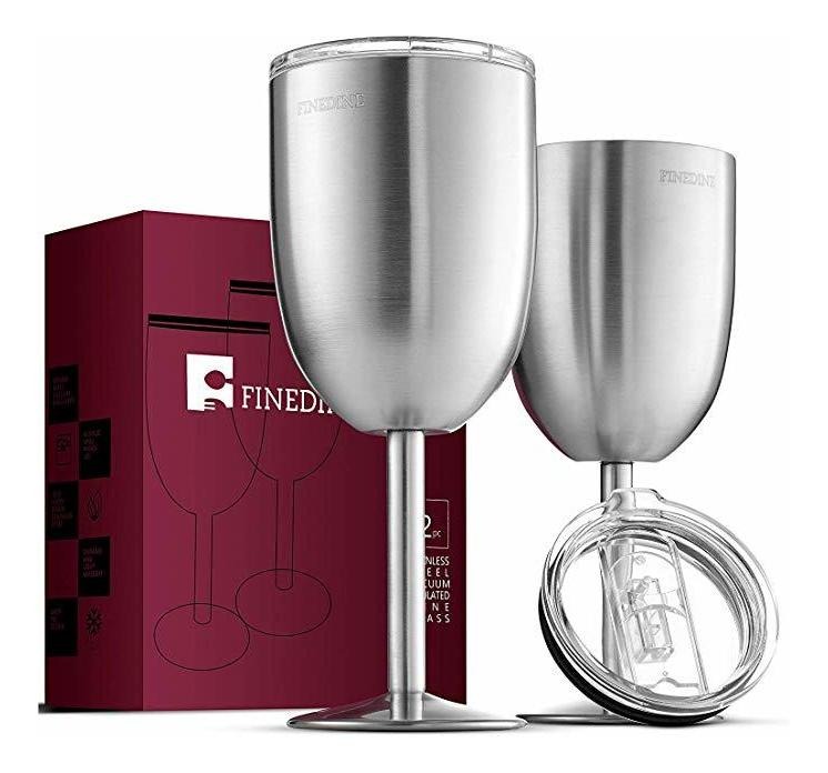 FineDine conjunto de 2 modernos elegantes copas de vino de acero inoxidable con tapa resistente a salpicaduras añade un toque contemporáneo a su colección copa de vino. Estos copa de vino vaso son de doble pared con aislamiento, cuentan con una base de la tapa y antideslizante clara libre de BPA que es perfecto para los viajes, al aire libre, paseos en bote, y más !; Estos copa de vino de acero inoxidable fijado construcción de doble pared mantiene vino a temperatura ambiente, independientemente de cómo caliente o frío que está fuera. Hecho de acero de calibre 18/8, estas copas de vino de acero son añicos y prueba de óxido para una copa de vino de metal que va a permanecer virgen en los próximos años y hace una excelente Navidad, vacaciones, cumpleaños y regalo especial ocasión .; A, tapa libre de BPA desmontable con junta de goma proporciona un sello fuerte, resistente a las fugas que se queda en incluso cuando la taza toma accidentalmente una caída. La tapa transparente permite la visibilidad del contenido del set de vino de acero y tiene una ventana de fácil deslizamiento para beber al mismo tiempo mantener los insectos y los desechos fuera de bebidas. Un labio pulgar empuje hace que la eliminación tapa fácil .; La parte inferior de los grandes vasos de vino tinto disponen de una base de goma antideslizante que agarra todas las superficies. El pie de la copa de vino es plana y estabilizado para mantener el color taza de metal en las mesas y mostradores. Estas gafas son perfectos para entretener a amigos tanto en interiores como al aire libre .; Una forma de bulbo cerveza negra se siente natural y cómodo cuando acunado en la mano, además de facilitar la mejora de los vinos respiren sabores y liberar sus aromas decadentes. Las copas de vino Pinot Noir borde delgado permite que el vino fluya limpiamente y elegantemente cuando se bebe. Diámetro: 8 ¿” altura, 3 ¼” ; 12 onzas Todos nuestros productos estan en inglés SKU 6081903607