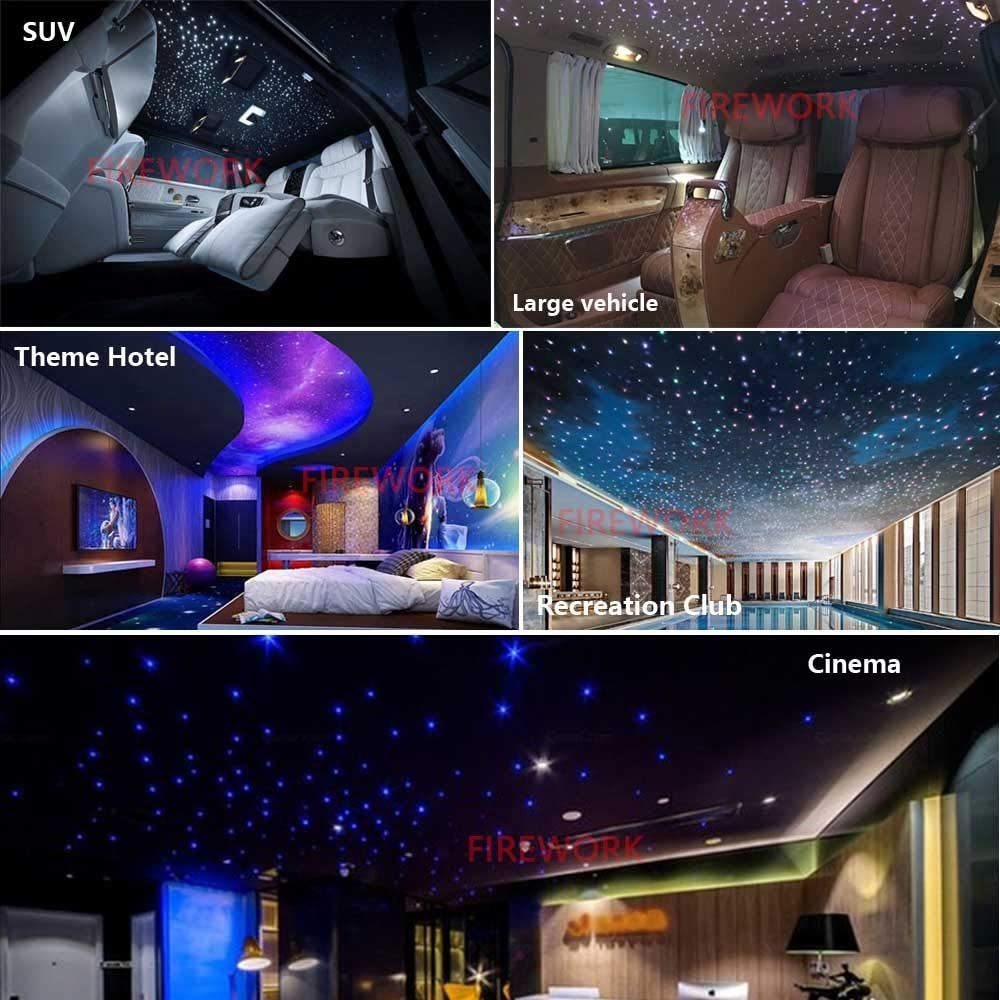 2021 New Upgrade 3 Control Methods: Bluetooth APP, Remote Control and Music Mode; When using the APP to control the light engine, there are more colors, modes, or music control functions.; Parameters Kit size: 420 PCS0.03in9.8ft long; Light engine: DC12V 16W RGBW music mode; Remote: 6 group modes(JUMP3, JUMP7, FADE3, FADE7, FLASH, BREATH), 17 colors(red, green, blue, mixd white, pure white, yellow, cyan, purple, etc); Bluetooth app: there are more colors, modes than remote.; Romantic Starry Sky Decorate your car or room like a sky full of stars, romantic and beautiful. Widely used in cars, living rooms, bedrooms, kitchens, restaurants, homes, KTV, etc.; More suitable scenes: weddings, birthdays, dinners. (Suitable for Car or Room.); High-quality FibersSafety, non-conductive, waterproof, long lifetime. (Keep the light engine in a dry place); Fast Service 2 Years WarrantyIf you have any problem with the product or installation, please feel free to contact us. Todos nuestros productos estan en inglés SKU 91221004555