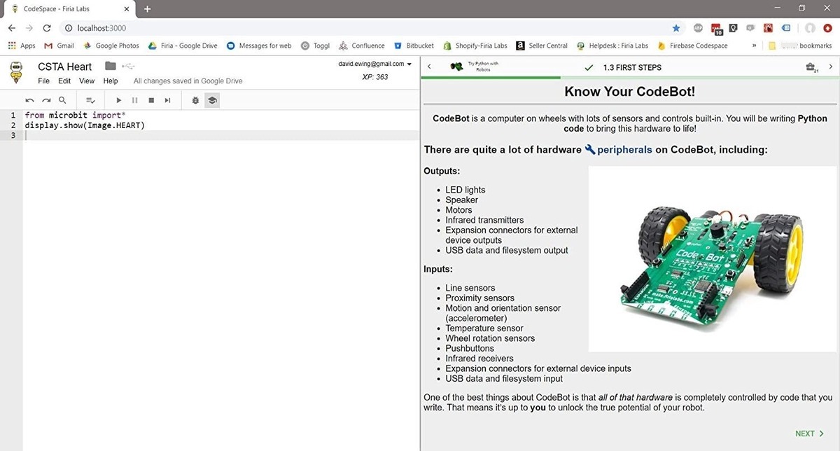CodeBot es un robot educativo aula probada construida para enseñar programación Python, Ciencias de la Computación, y los principios de la robótica; Incluye acceso ilimitado a la plataforma web CodeSpace, la integración de los módulos del plan de estudios de acoplamiento con un potente entorno de desarrollo Python; Funciona muy bien con los Chromebook, PC o Mac; Ningún software a instalar; Proyecto Python con Robots plan de estudios basado incluido; Alineado con los estándares Informática educativos; Totalmente robot autónomo controlado por código escrito; No es un robot de juguete de control remoto; Enseña en el mundo real de codificación en Python, un lenguaje de programación Professional Todos nuestros productos estan en inglés SKU 403211648